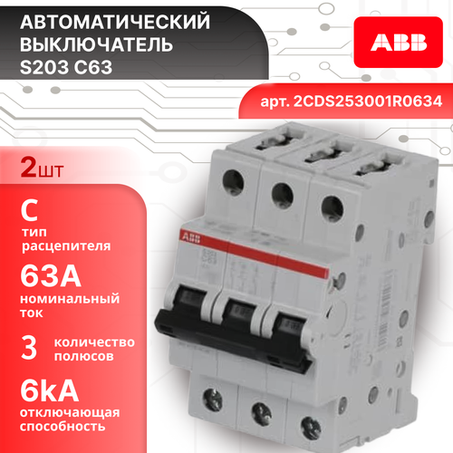 Купить Автоматический выключатель 3P (3П) 63А тип C 6кА S203 ABB 2CDS253001R0634 2шт с доставкой по всей России.