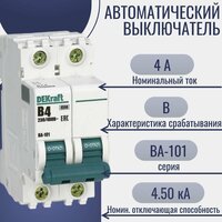 Автоматический выключатель серии ВА-101 DEKraft; 2P; номинальный ток 4 А; характеристика В; отключающая способность 4,5 кА. Новый механизм расцепления мгновенно разрывает цепь при возникновении аварии. 5 монолитных заклепок повышают прочность корпуса аппарата. Сплошная лицевая панель обеспечивает безопасность эксплуатации аппарата. Боковые каналы охлаждения повышают стабильность работы при высоких температурах окружающей среды. Полностью автоматизированный контроль качества производства.