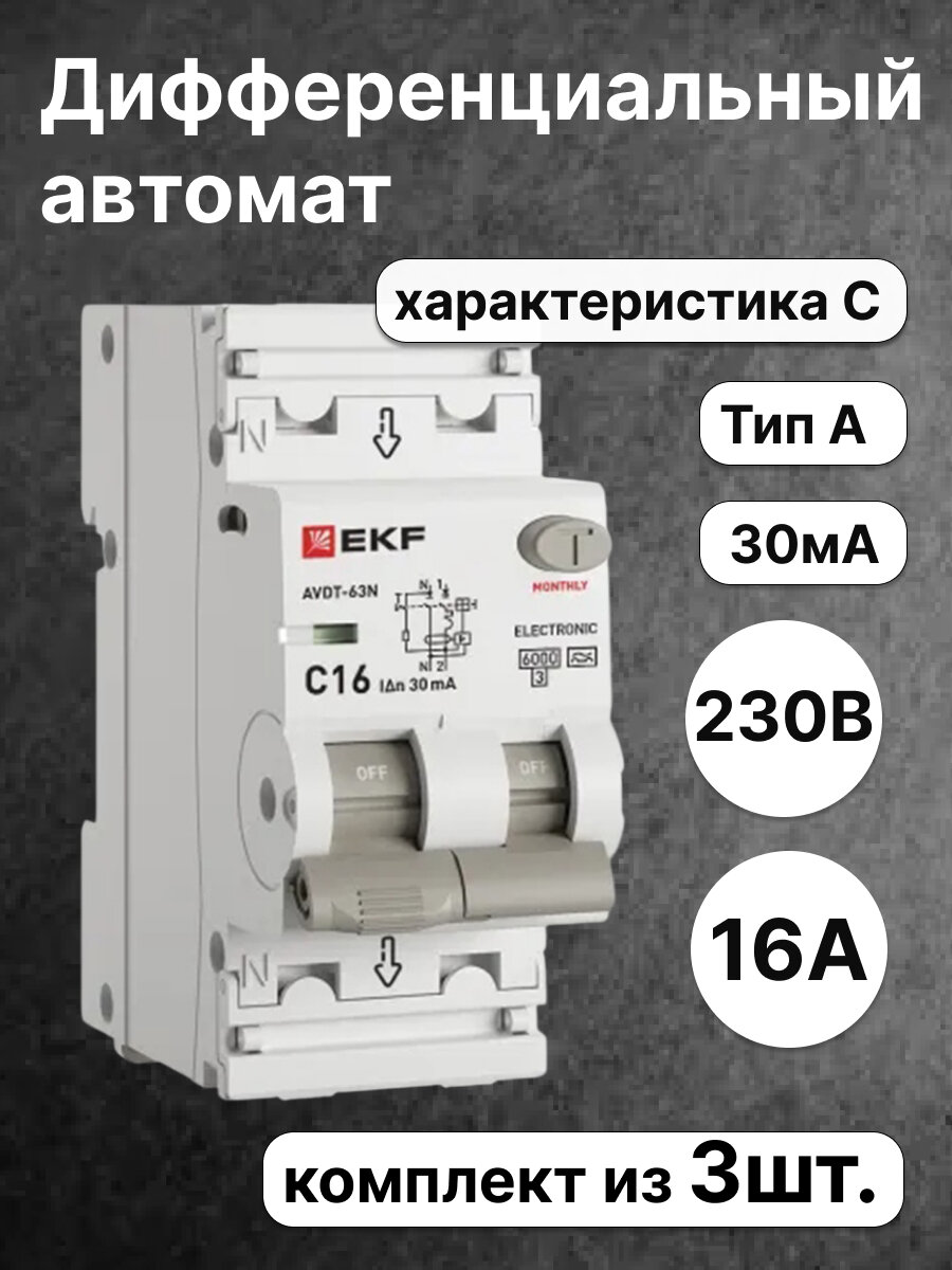 АВДТ-63N автоматический выключатель дифференциального тока 1P+N 16А 30мА характеристика C тип A электронный 6кА PROXIMA EKF D63N26EA16C30