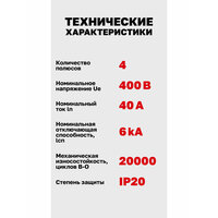 Технические характеристики этого автоматического выключателя впечатляют: номинальный ток 40А, номинальное напряжение до 400В, работа с переменным током (AC) и возможность подключения как медными, так и алюминиевыми проводниками максимальным сечением до 25 мм². Модель обладает шириной в 4 стандартных модуля и подходит для установки на DIN-рейку. Использование такого устройства гарантирует надежную и стабильную работу электросистемы.