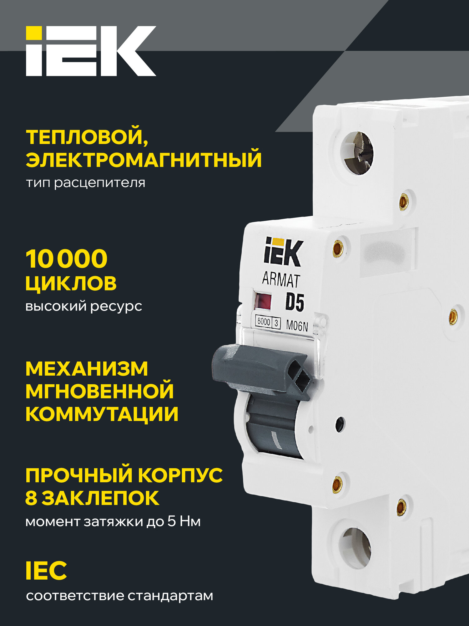 В комплекте с выключателем поставляется однополюсный автоматический выключатель IEK (ИЕК) с номинальным током 5 А и максимальным сечением подключаемого кабеля 25 мм².