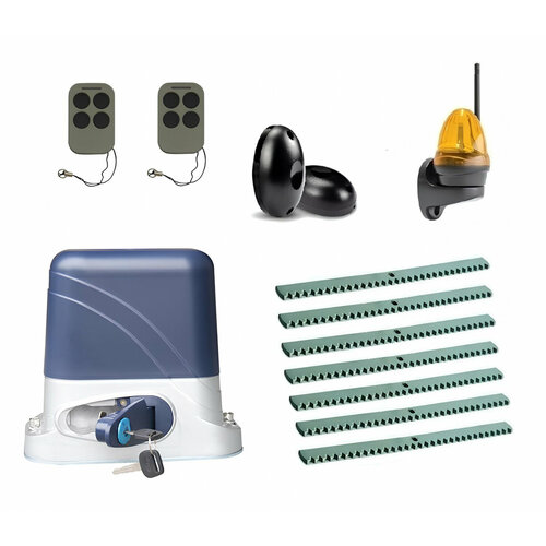 Состав комплекта: Привод KSL-1300 для откатных ворот, автоматика корн, комплект: привод, 2 пульта - 1 шт, Зубчатая рейка для откатных ворот корн KR-8, M4 30х8х1000 мм, с крепёжным комплектом - 7 шт, Фотоэлементы корн AIS-10 - 1 шт, Лампа сигнальная светодиодная с антенной корн ADL-2 - 1 шт.