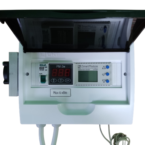 Автоматика не имеет вилки для подключения питания и розетки для подключения ТЭНа, так как рассчитана на мощность 6 кВт (вилки и розетки рассчитаны на мощность не более 3,5 кВт). Подключение питания и ТЭНа необходимо производить непосредственно к клеммам в щитке и клеммам ТЭНа или воспользоваться специальными силовыми разъемами, рассчитанными на нужную мощность.