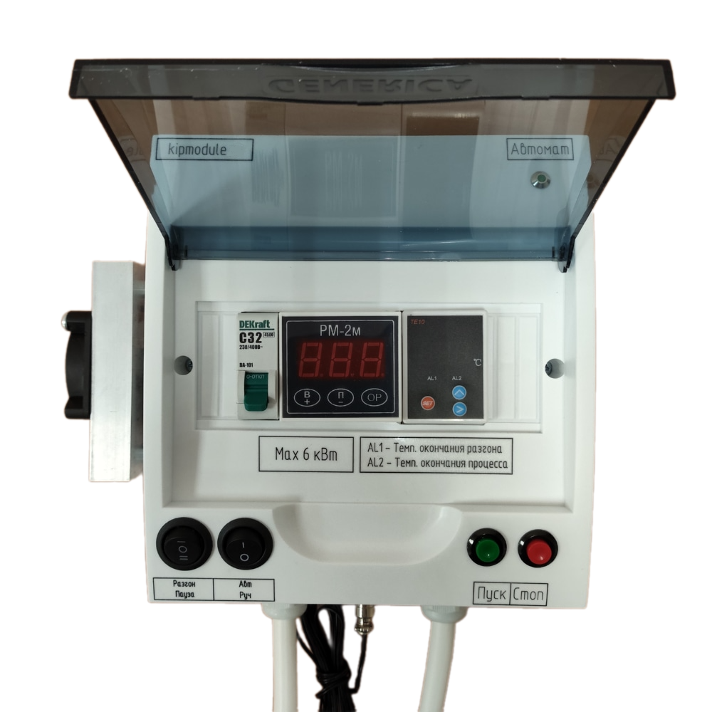 В автоматическом режиме запуск автоматики осуществляется кнопкой «Старт», а принудительная остановка кнопкой «Стоп». После старта автоматика подает на ТЭН 100 % мощности (режим Разгон). После того как температура достигнет заданной Вами температуры в терморегуляторе (температура 1), на ТЭН начинает подаваться мощность, которую Вы установили в приборе РМ-2м. При понижении температуры (провал процесса) будет включаться режим Разгон. После того, как температура достигнет второй температуры, установленной Вами в терморегуляторе (температура 2), ТЭН отключается.