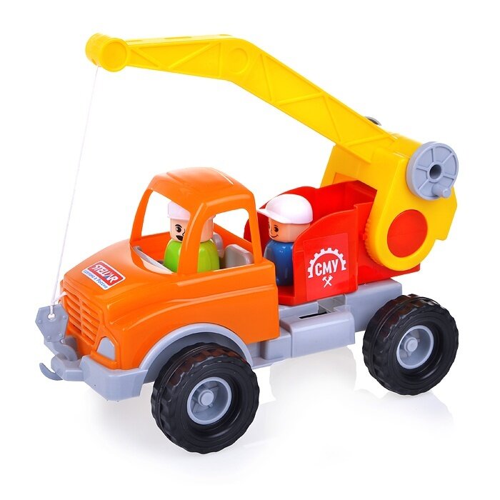 модель выполнена в виде автокрана, представляющего собой машину с двухместной кабиной, в кузове которой находится подвижная стрела с крюком; стрела крана оснащена функциональной лебедкой, отвечающей за длину троса; для компактного и удобного хранения игрушки, крюк автокрана можно зацепить за специальную петельку на его переднем бампере; платформа «Автокрана» поворачивается на 360 градусов; машина имеет схожий с настоящей техникой внешний вид, а ее кузов выполнен в яркой цветовой гамме, которая может варьироваться; в кабине машины находятся водитель и рабочий, они помогут сделать игру более реалистичной; колеса машинки вращаются, поэтому ее можно катать по ровной горизонтальной поверхности, всего их 2 пары; игрушка изготовлена из безопасных материалов высокого качества, которые устойчивы к деформации и не содержат вредных, а также токсичных веществ в своем составе; упаковка - сетка