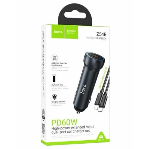 Автомобильное заряд. устр. Hoco Z54B с шнуром Type-C на Type-C 2C 60W. Материал алюминиевый сплав 2. Длина * диаметр: 82,5 * 25 мм, общий вес: 50 г 3. Выход: USB-C1/C2:30 Вт (PD/QC/FCC/AFC); USB-C1+USB-C2=30Вт+30Вт 4. Бесплатный кабель для быстрой зарядки 1mC to C 60W.
