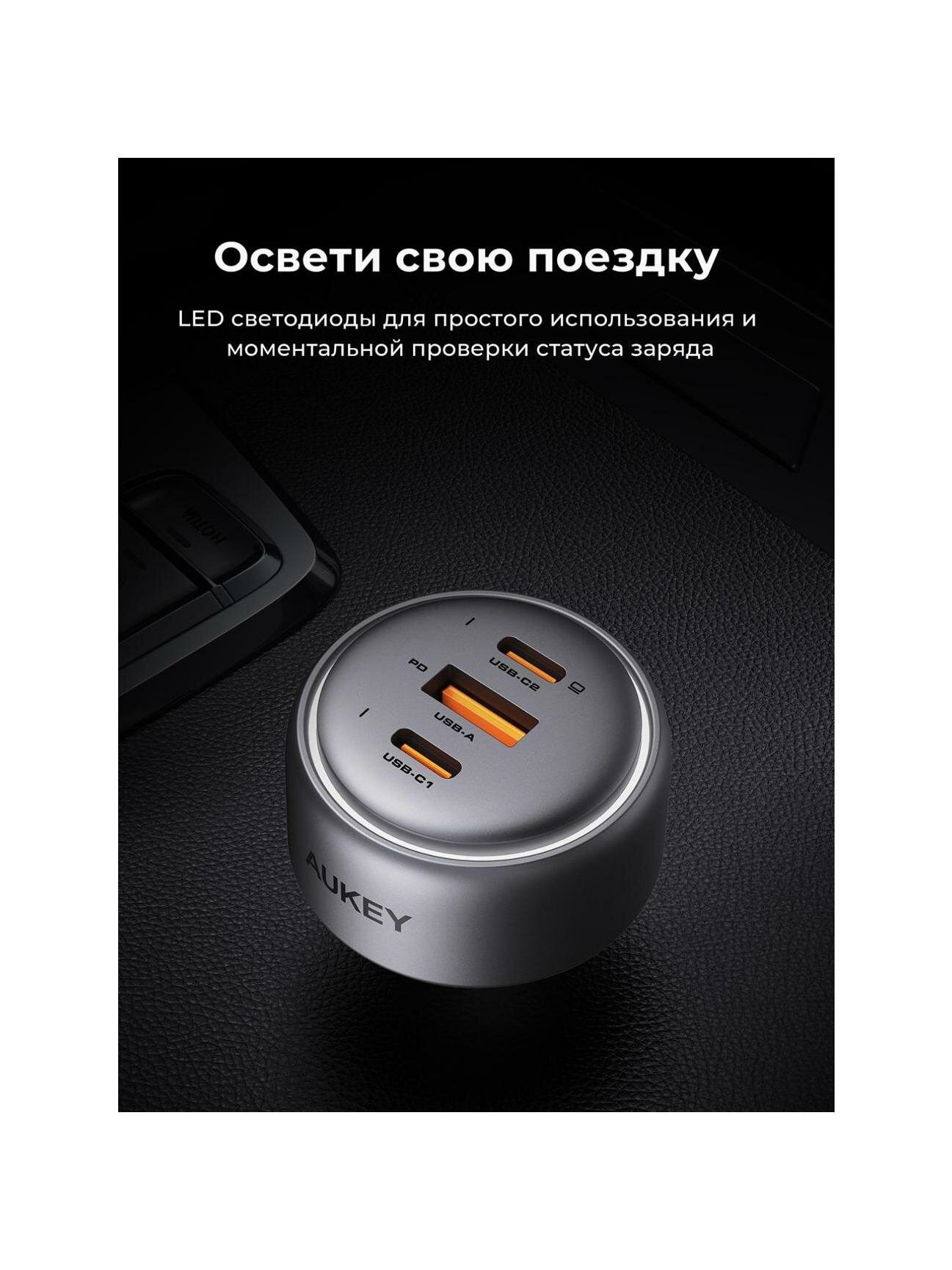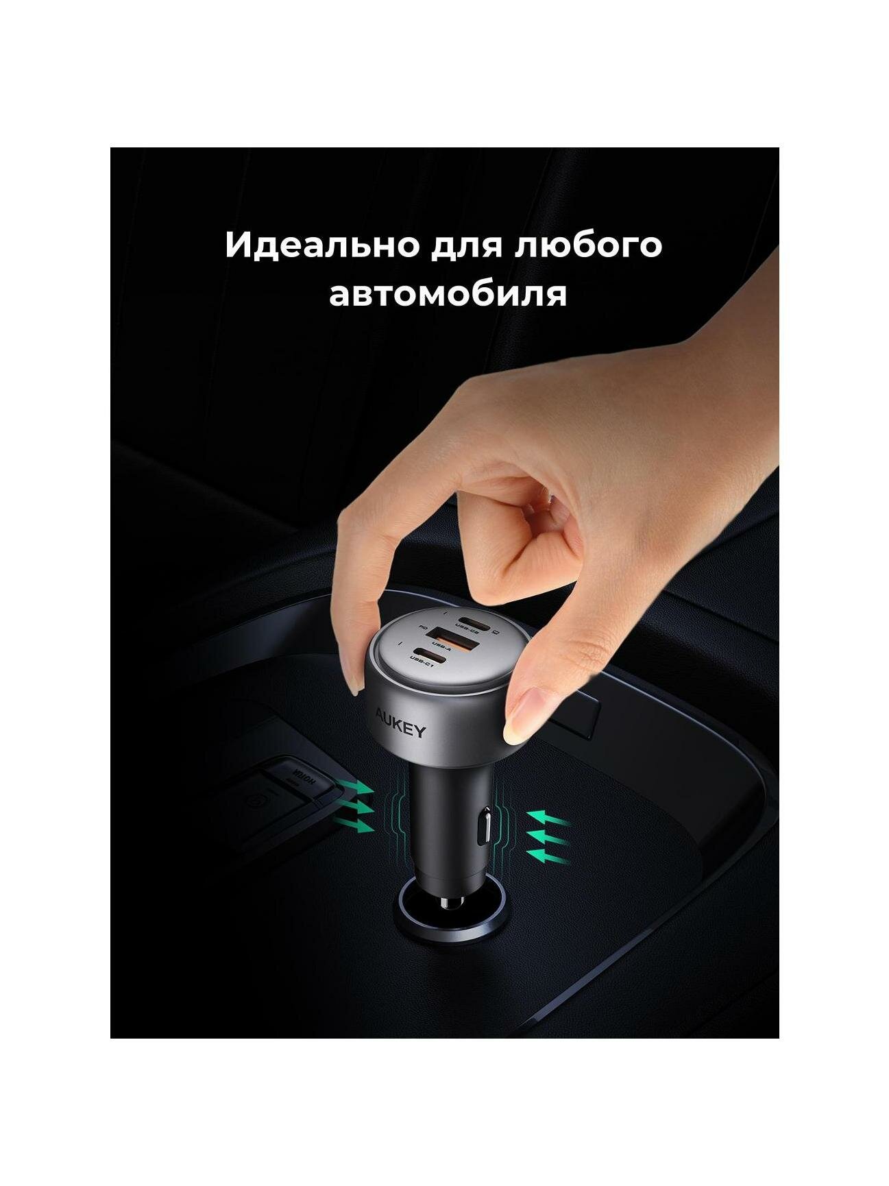 Автомобильное зарядное устройство Aukey CC-P3 функционирует от прикуривателя и подходит для использования в любом авто.