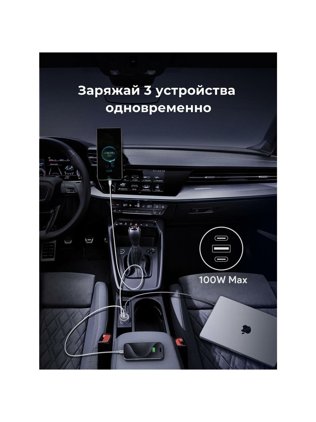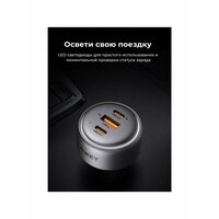 К устройству можно одновременно подключать до трех смартфонов или других предметов через порты USB Type-C, USB 2.0 тип А. Световые индикаторы увеличивают комфорт использования. Модель обеспечивает выходное напряжение 100 В и ток до 5000 мА.