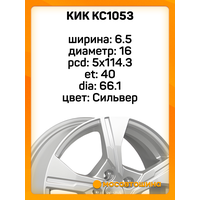 Купить Автомобильные диски КиК КС1053 6.5×16 5×114.3 ET 40 Dia 66.1 Сильвер с доставкой по всей России. Автомобильные диски КиК КС1053 6.5×16 5×114.3 ET 40 Dia 66.1 Сильвер: сравнение цен, характеристики, фото, актуальное наличие и цены.