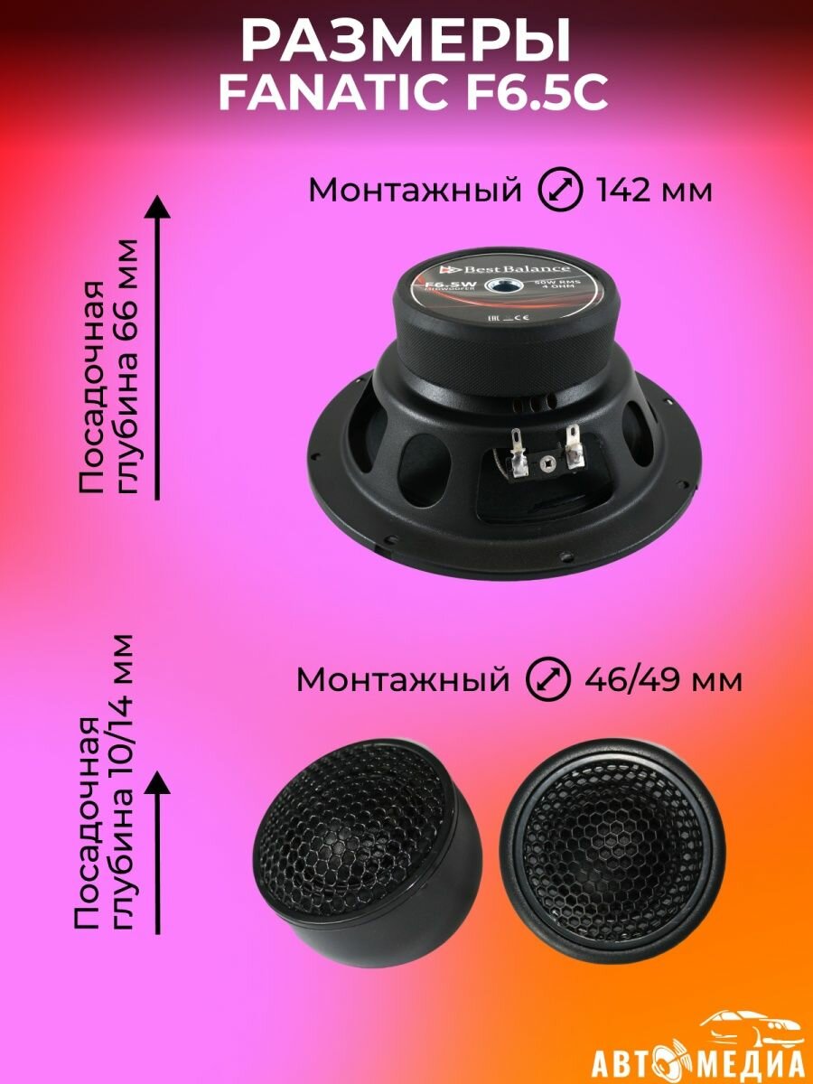 Best Balance F6.5C - 2-компонентная акустическая система F-серии. Мидбас из целлюлозы с пропиткой, шёлковые ВЧ с кроссовером 2го порядка и различными чашками для монтажа. Динамики бренда Бест баланс (Beat Balance) - один из лучших вариантов с высоким уровнем громкости для замены штатной акустики. Громкая акустика диаметром 16 (16,5) см. Легкость и надежность динамиков позволят без проблем установить их в Ваш автомобиль. По доступной цене вы получаете комплект сразу из 2 динамиков. Автомобильные колонки 16 диаметра подходят к любому авто в целях замены штатных динамиков. Качественные акустические системы 16,5 позволяют наслаждаться мощным эстрадным звучанием в салоне машины, а компактность и универсальность громкоговорителей, простота их установки делает их идеальным решением для инсталляции и модернизации штатных аудиосистем. Рекомендуется для создания полноценной акустической системы в автомобиле. Автоколонки имеют следующие характеристики: