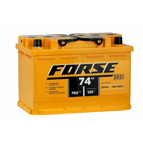 Автомобильный аккумулятор премиум класса FORSE 74 Ah (обратная полярность) - это надежный и мощный источник энергии для вашего автомобиля. Он обладает пусковым током 760 ампер, что позволяет быстро запускать двигатель даже в самые холодные дни.