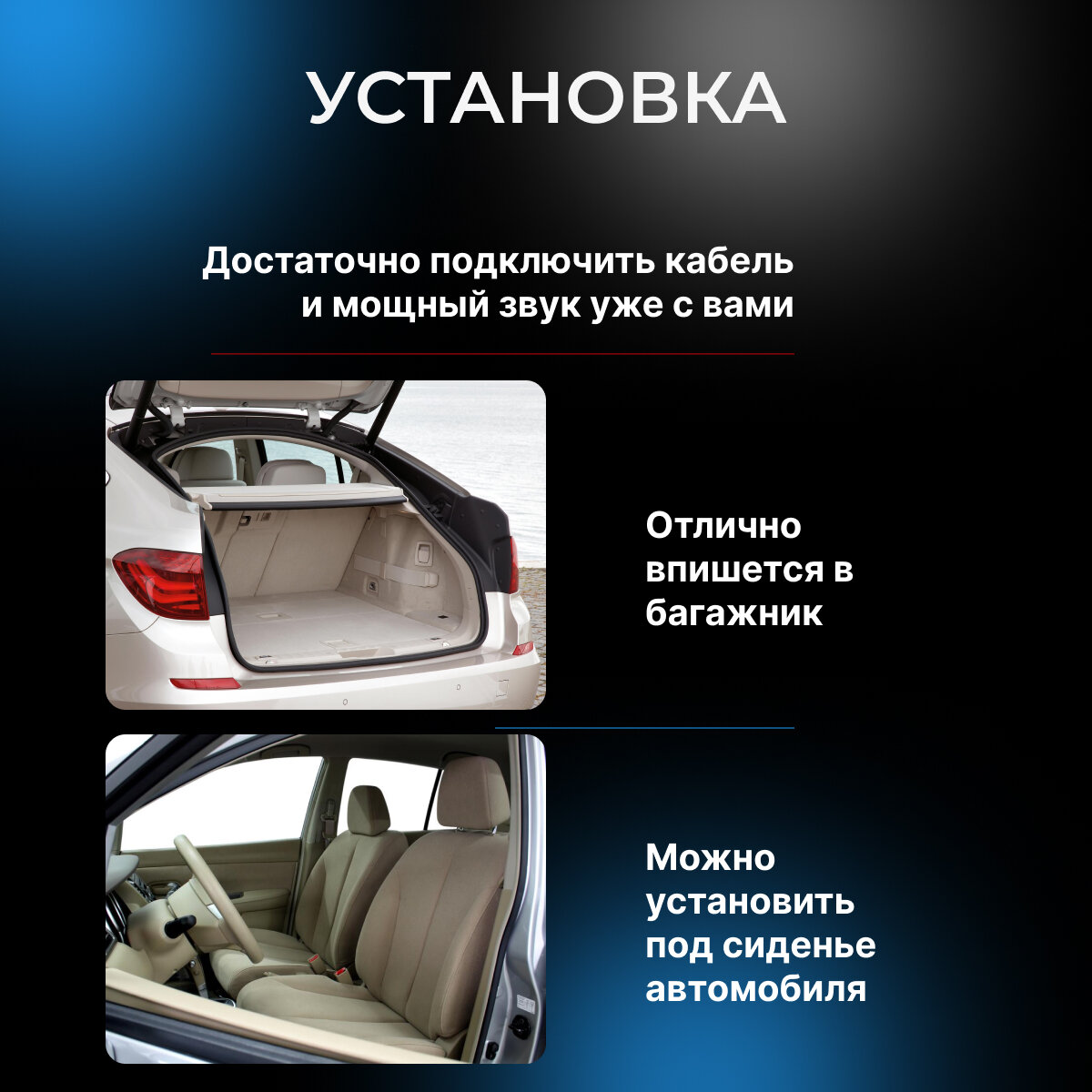 Сабвуфер обладает регулируемыми функциями качества звучания, которые позволяют настроить звук по вашему вкусу, регулируя громкость через вашу магнитолу. Он идеально впишется в интерьер вашего автомобиля, занимая минимум места как в багажнике, так и в салоне.