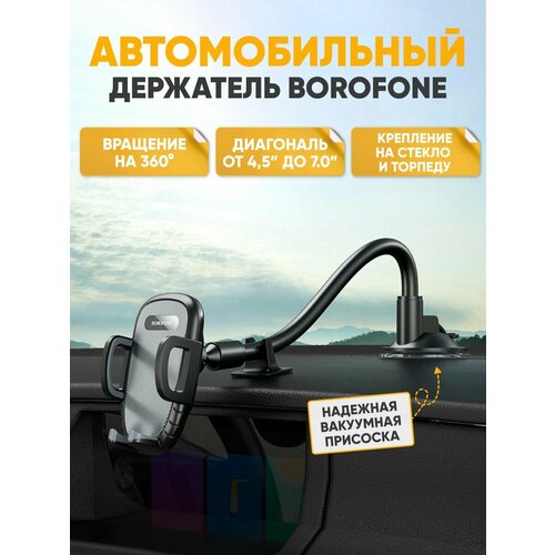 Держатель для телефона BOROFONE H54 - аксессуар в машину – незаменимый помощник для каждого автолюбителя. Крепкие боковые планки держателя позволят надежно зафиксировать устройство. Держатель и подставка для телефона в машину идеально подходит для навигатора, просмотра любимых фильмов, а также разговора по видеосвязи. Кронштейн для телефона с гибкой ножкой изготовлен из качественного абс пластика и силикона, который долго служит и сложно подвергается износу и поломке. Телефон держатель для машины подойдет для мобильного телефона с диагональю 4.7-6.7 дюймов и шириной 53-95мм и весит всего 130 грамм. Держатель на лобовое стекло фиксируется при помощи прочной вакумной присоски, которую можно крепить как к лобовому стеклу, так и к панели авто. Благодаря прочной и простой технологии, клейкая гелеевая присоска будет держаться при любых условиях. Удобной функцией крепления для телефона является широкий угол наклона – ножка поворачивается на 360 градусов и имеет длину 34см, что обеспечит комфорт при использовании гаджетов. Отдельно стоит отметить внешний вид держателя и крепления для телефона в машину, стильный и минималистический дизайн отлично впишется в любой салон автомобиля и станет прекрасным аксессуаром. Автомобильный держатель для телефона станет отличным подарком как парню, папе, другу, брату, так и девушке, жене, маме, подруге, сестре на любой праздник (Новый год, Рождество, 8 марта, 23 февраля).