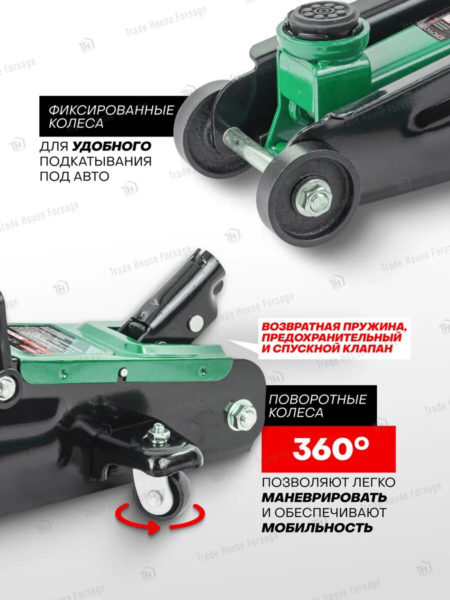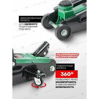 Домкрат имеет два поворотных колеса на 360 градусов для плавной маневренности и 2 фиксированных для устойчивости.