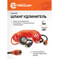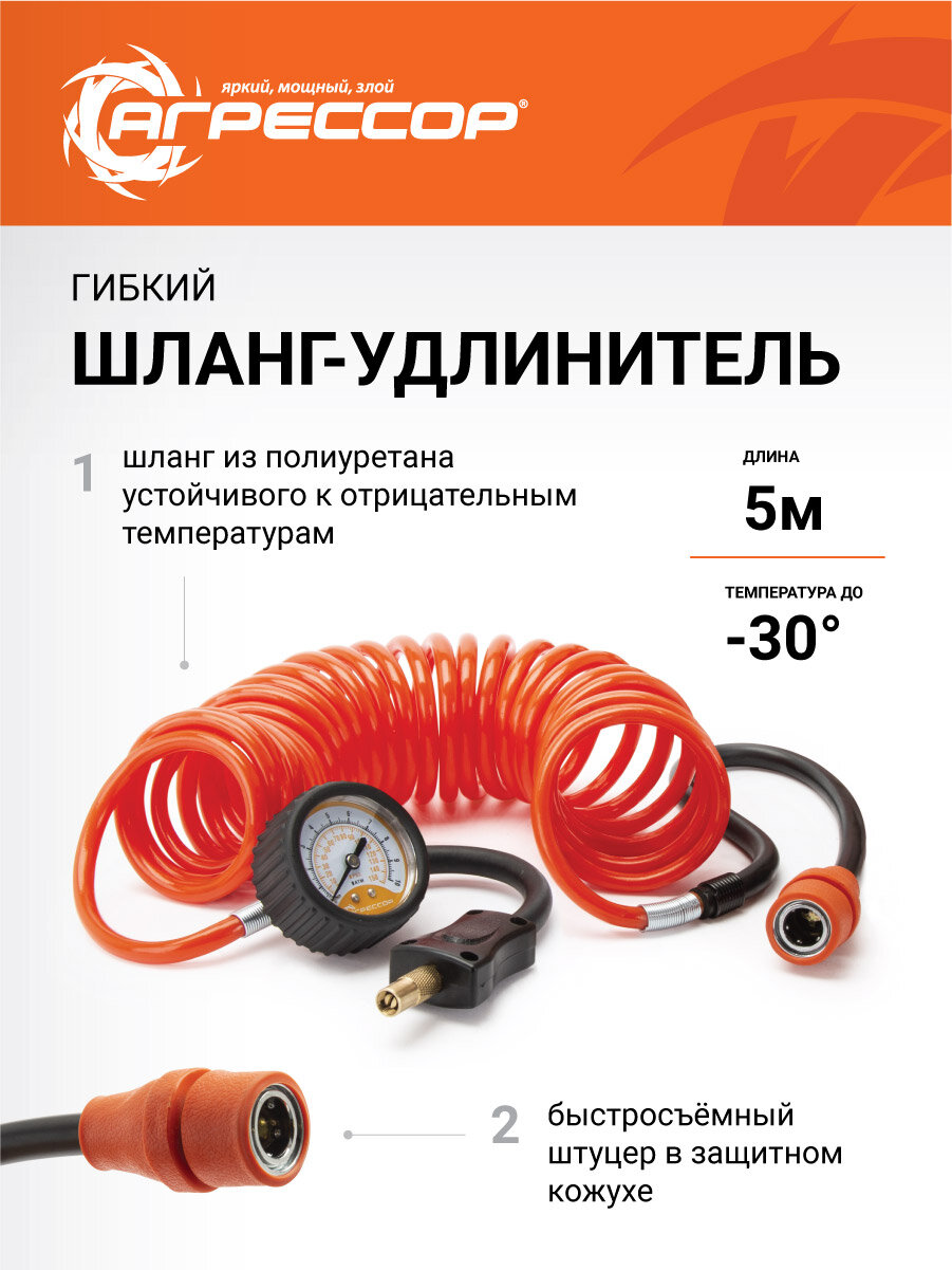 Компрессор оснащен гибким шлангом-удлинителем из морозостойкого полиуретана длиной 5 метров, который не теряет эластичность даже при низких температурах. Шланг покрыт термопластом, который защищает руки от соприкосновения с холодным металлом штуцера шланга. В шланг встроен высокоточный двушкальный манометр и перепускной клапан для выравнивания давления в шинах.