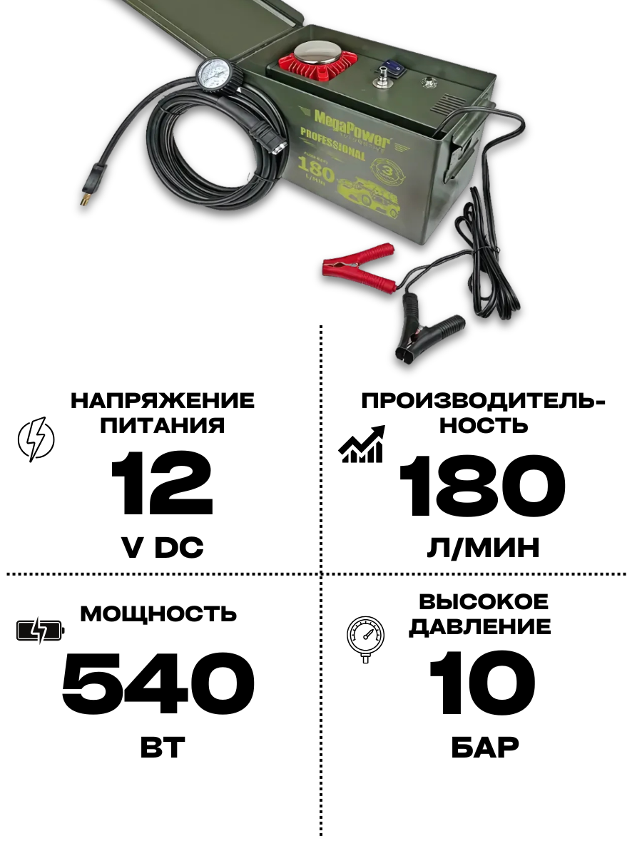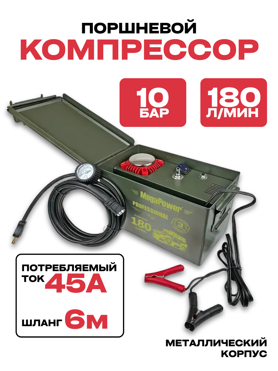 Автомобильный компрессор MEGAPOWER PROFESSIONAL, поршневой 150PSI, 180л/мин, 45А, 540W, дефлятор, 12V, арт. M-18010: сравнение цен, характеристики, фото, актуальное наличие и цены.