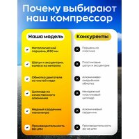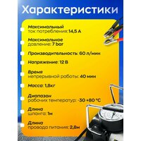 Удобная сумка для переноски, Набор насадок, Работа от клемм аккумулятора, Невысокий уровень шума, Амортизационные опоры, Питание от прикуривателя, Автоматическое отключение, Погрешность +- 0.01 Атм, автомобильный компрессор, Индикация давления, Универсальные насадки в комплекте, Цена деления манометра 0.1, в комплекте,