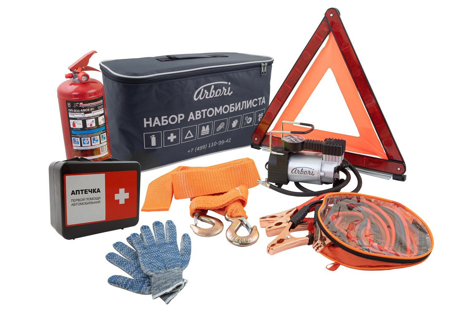 Купить Автомобильный набор ARBORI Extra (аптечка, огнетушитель, знак, перчатки, трос 5 т, компрессор, провода) с доставкой по всей России.