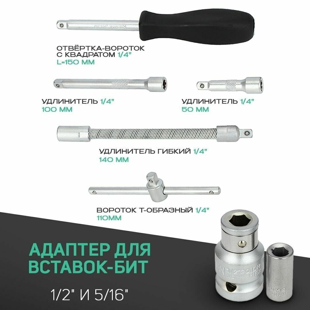 2 шт. - Вставки 5/16" крест (Phillips) - РH3, РН4Весь инструмент надежно зафиксирован в прочном пластиковом кейсе для удобного хранения и переноски. Размер кейса 38,5*28,5*8,5 см.