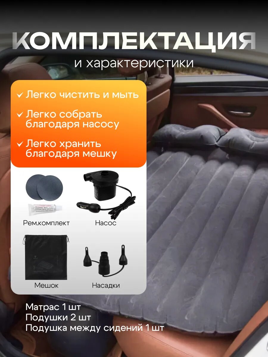 Автоматрас - настоящая находка для любителей дальних путешествий на машине. Он поможет восстановить силы после долгого пребывания за рулем и обеспечит комфортный отдых в любых условиях. Уникальной особенностью матраса является специальная секция, предназначенная для установки между сиденьями автомобиля. Она создает дополнительную опору для поверхности матраса, обеспечивая ровность и удобство использования. Конструкция авто-матраса включает специальную секцию-опору, которая заполняет пространство между передними и задними сиденьями, создавая ровную и устойчивую поверхность. Изготовленный из прочного ПВХ с мягким флокированным покрытием, матрас приятен на ощупь, устойчив к влаге и легко чистится. Размеры изделия позволяют комфортно разместиться одному или двум взрослым, выдерживая нагрузку до 150 кг. В комплект входят две надувные подушки, набор для ремонта и насос, работающий от автомобильного прикуривателя (12V), что обеспечивает быстрое и удобное надувание за считанные минуты. Надувной матрас легок и удобен в использовании. Оттенок цвета может отличаться от фото в карточке товара!