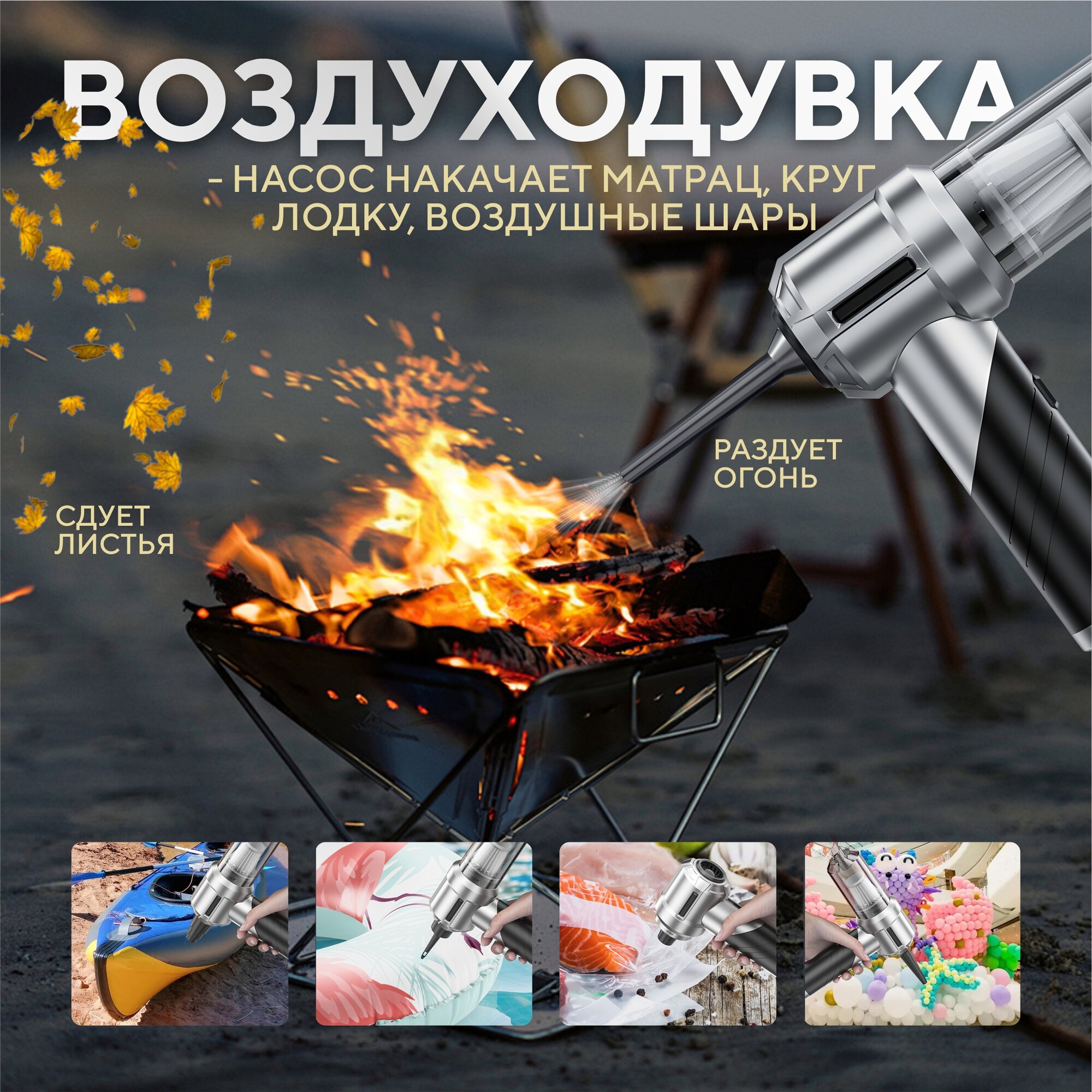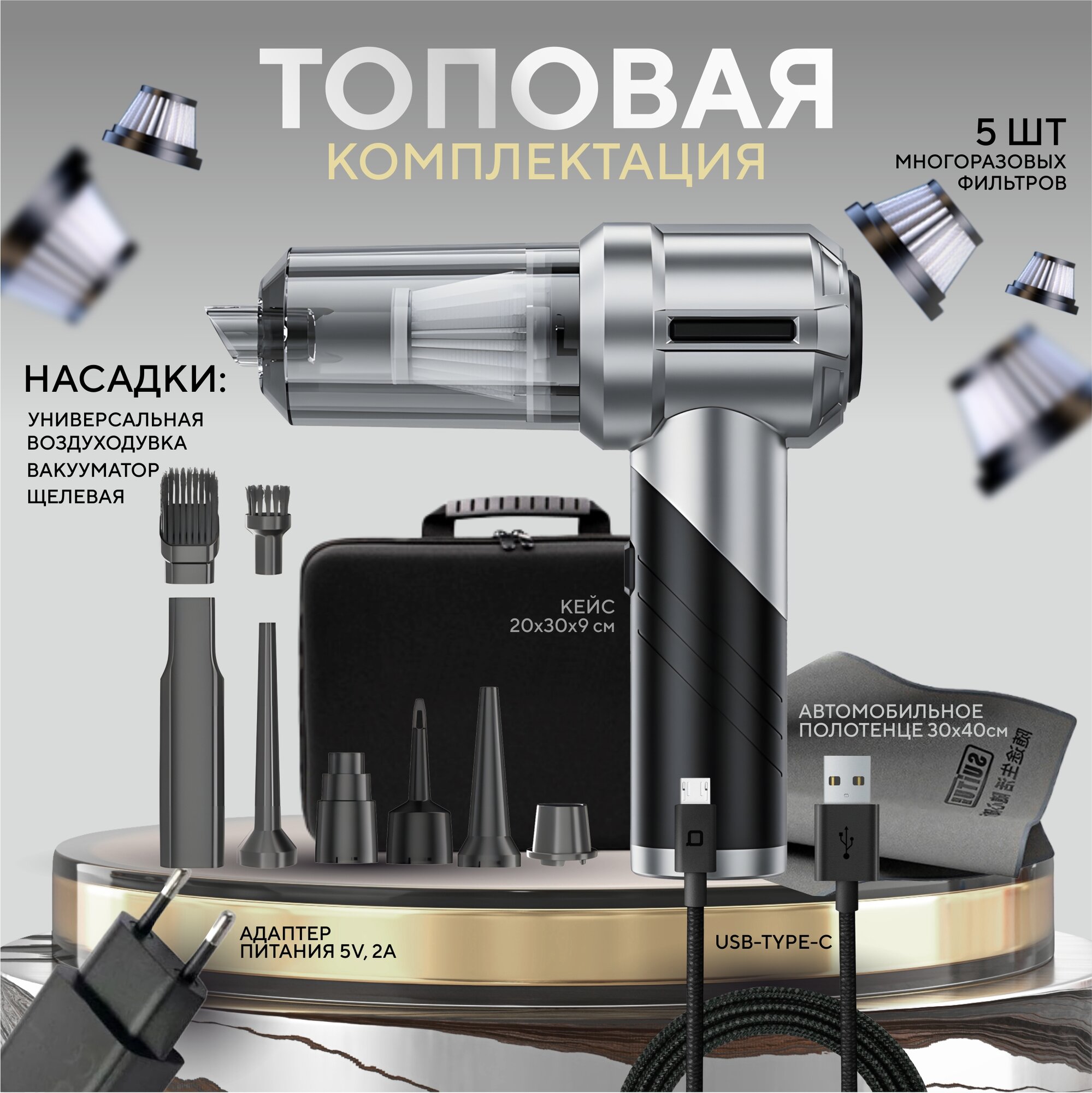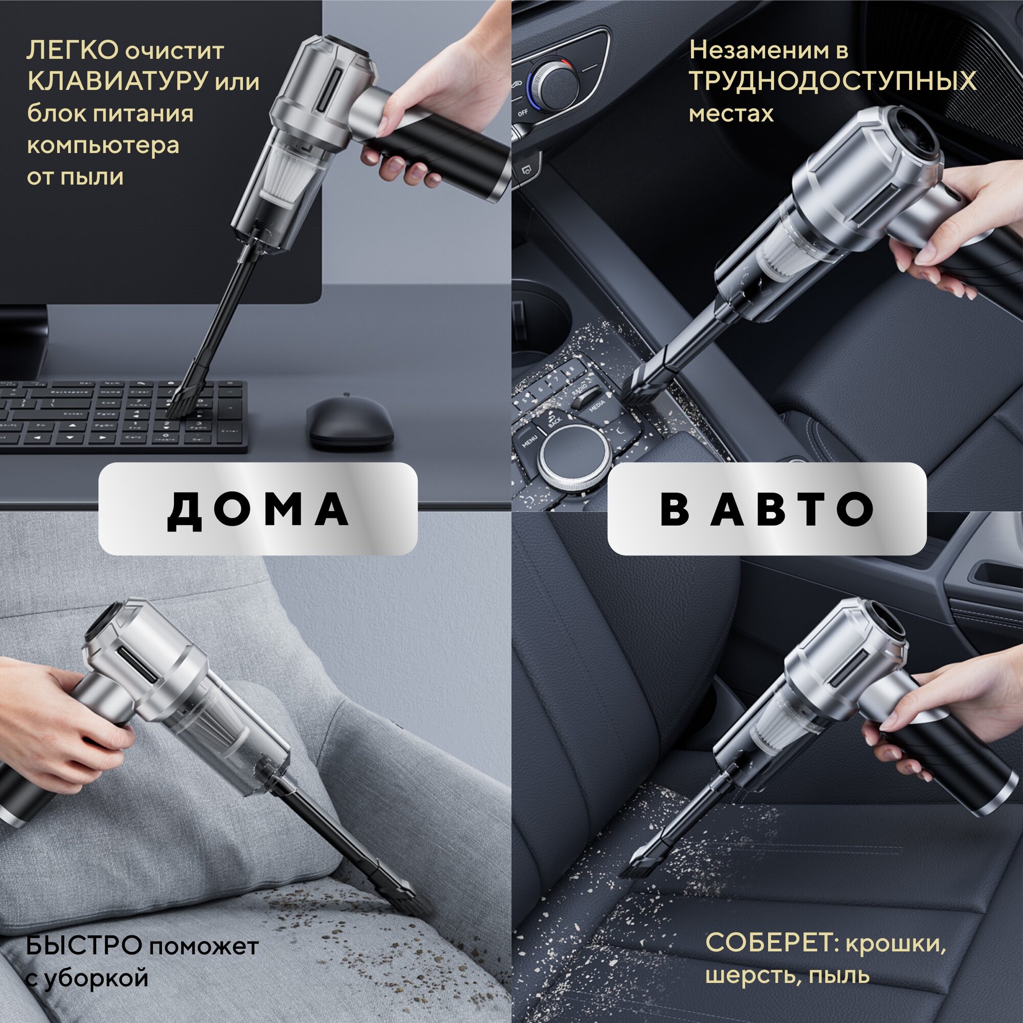 Наш пылесос это портативный мини гаджет без проводов и с размерами в кейсе 20×30 см, поэтому Вы можете взять его с собой куда угодно. Автопылесос можно использовать не только для чистки авто, он отлично подойдет для мягкой мебели, кресла или дивана. Поможет быстро пропылесосить различные поверхности в доме, а надев длинную насадку ветродуй, Вы получите воздуходувка для мангала, насос для шариков, насос для надувного матраса ! Так же он идеален в использовании как воздуходувка для ноутбука и компьютера. Беспроводной пылесос для автомобиля компактного размера не занимает много места при хранении и перевозке.