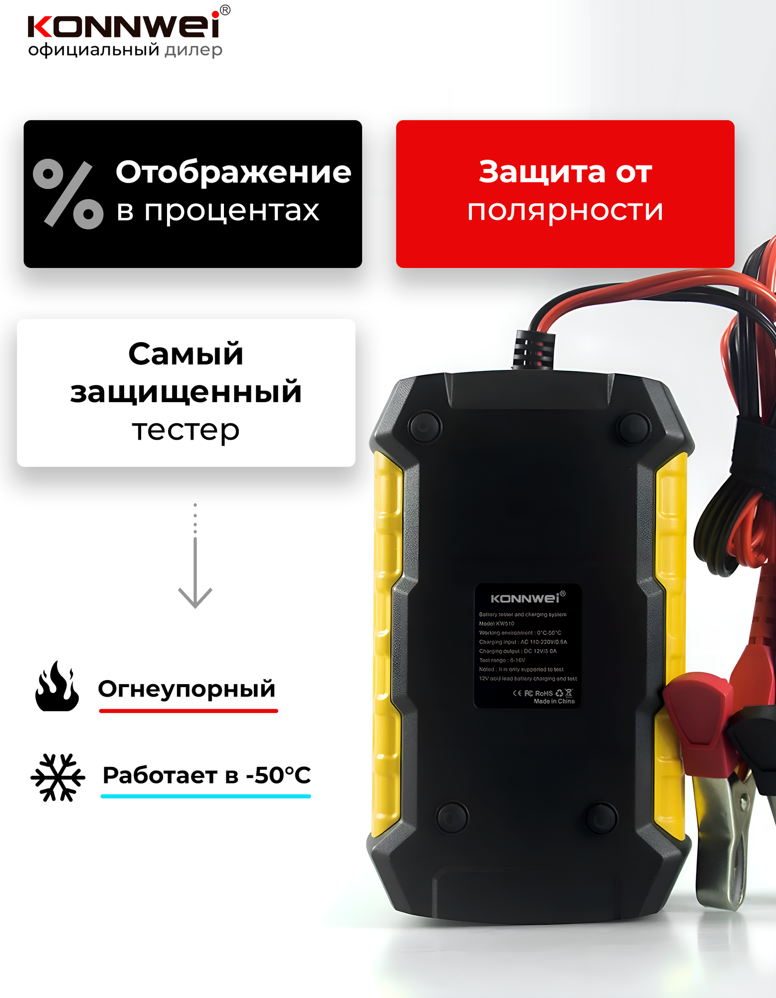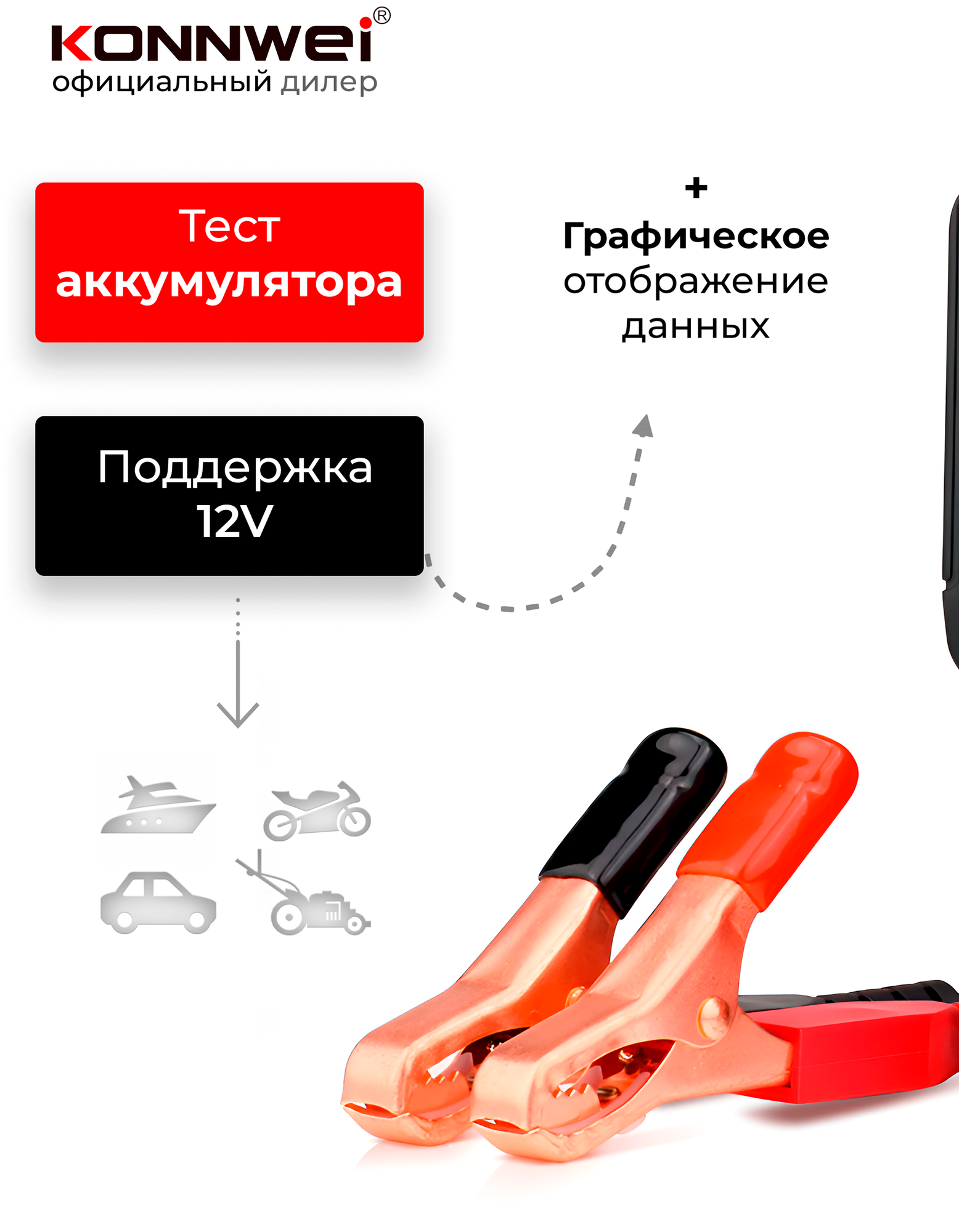 Konnwei KW510 подходит к любым моделям автомобилей с аккумуляторной батареей с напряжением 12В. Мощный процессор и хорошие технические характеристики позволяют производить замеры с высокой точностью и плавной работой интерфейса, надежные провода и качественный корпус прослужат долгое время.