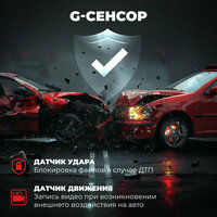 - G-сенсор: запись при возникновении внешнего воздействия на автомобиль и защита файлов от перезаписи в случае ДТП;