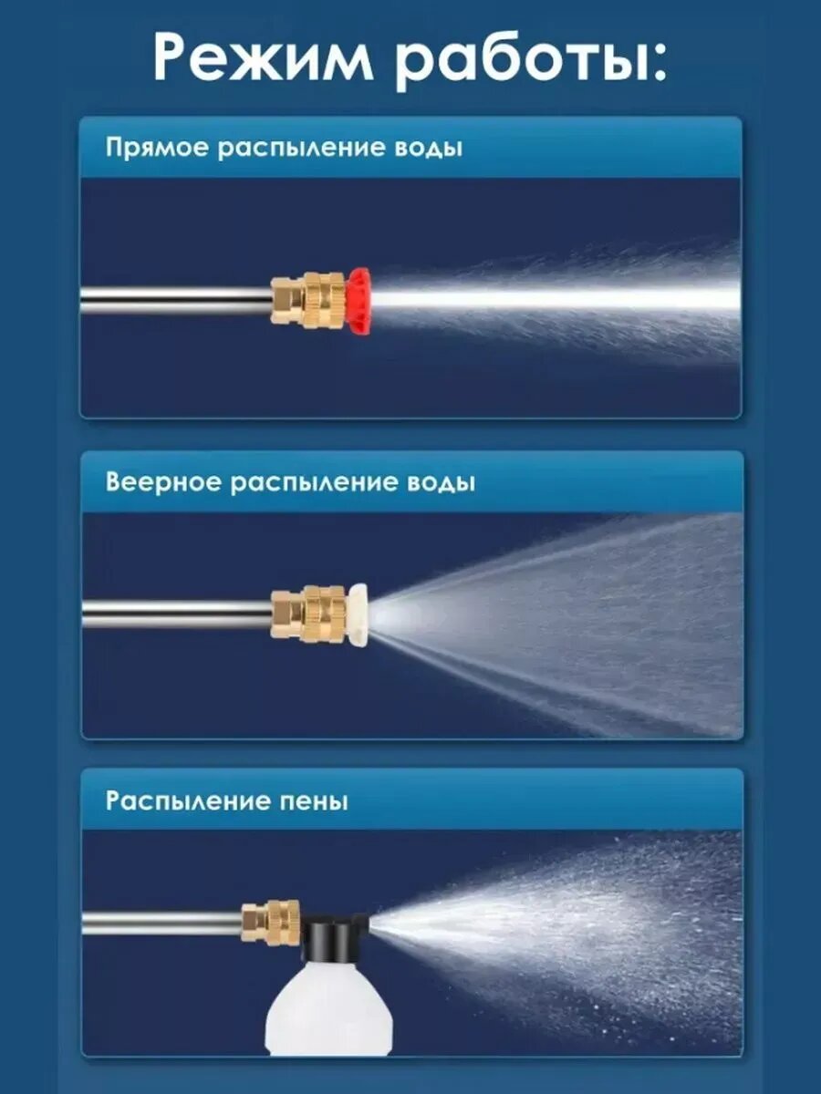Аккумуляторная минимойка высокого давления - ваш незаменимый помощник в деле уборки! Это устройство не только облегчит вам жизнь, но и поможет сэкономить время и усилия. Очистка ковров, окон, садовых аксессуаров и инвентаря, бытовых предметов - все это станет быстрым и эффективным процессом с минимойкой. Устройство способно удалять твердую присохшую грязь и пыль с поверхностей, делая их сияюще чистыми. Мини-автомойка с двумя аккумуляторами — это удобное и многофункциональное устройство, которое обеспечивает эффективную авто мойку автомобиля в любом удобном для Вас месте. Переносной автомобильный набор для гаража включает три различные насадки: рассеивающий спринклер, спринклер высокого давления и пеногенератор для химической чистки, что позволит выбрать оптимальный режим для каждой задачи. 2 мощных аккумулятора обеспечивают до 80 минут беспрерывной работы, что делает процесс минимойки быстрым и удобным. Прочный и гибкий шланг насоса длиной 5 метров дает свободу движения и позволяет использовать очень горячую воду с паром для более эффективной чистки. Встроенный фильтр для воды гарантирует чистоту жидкости и защиту от загрязнений, что продлевает срок службы устройства. Мощный мотор беспроводного пистолета на 100 Вт обеспечит высокое давление воды, а встроенная система защиты от перегрева гарантирует безопасность использования. Этот портативный мини аксессуар идеально подходит для автовладельцев, которые ценят удобство и качество. Компактный кейс обеспечивает легкую транспортировку и хранение. Будьте уверены, что с нашей аккумуляторной автомойкой Ваша машина всегда будет выглядеть чистой и ухоженной. Внимание! Мойка НЕ предназначена для подключения К водопроводной сети! Важно! С заботой о Вашем удобстве.