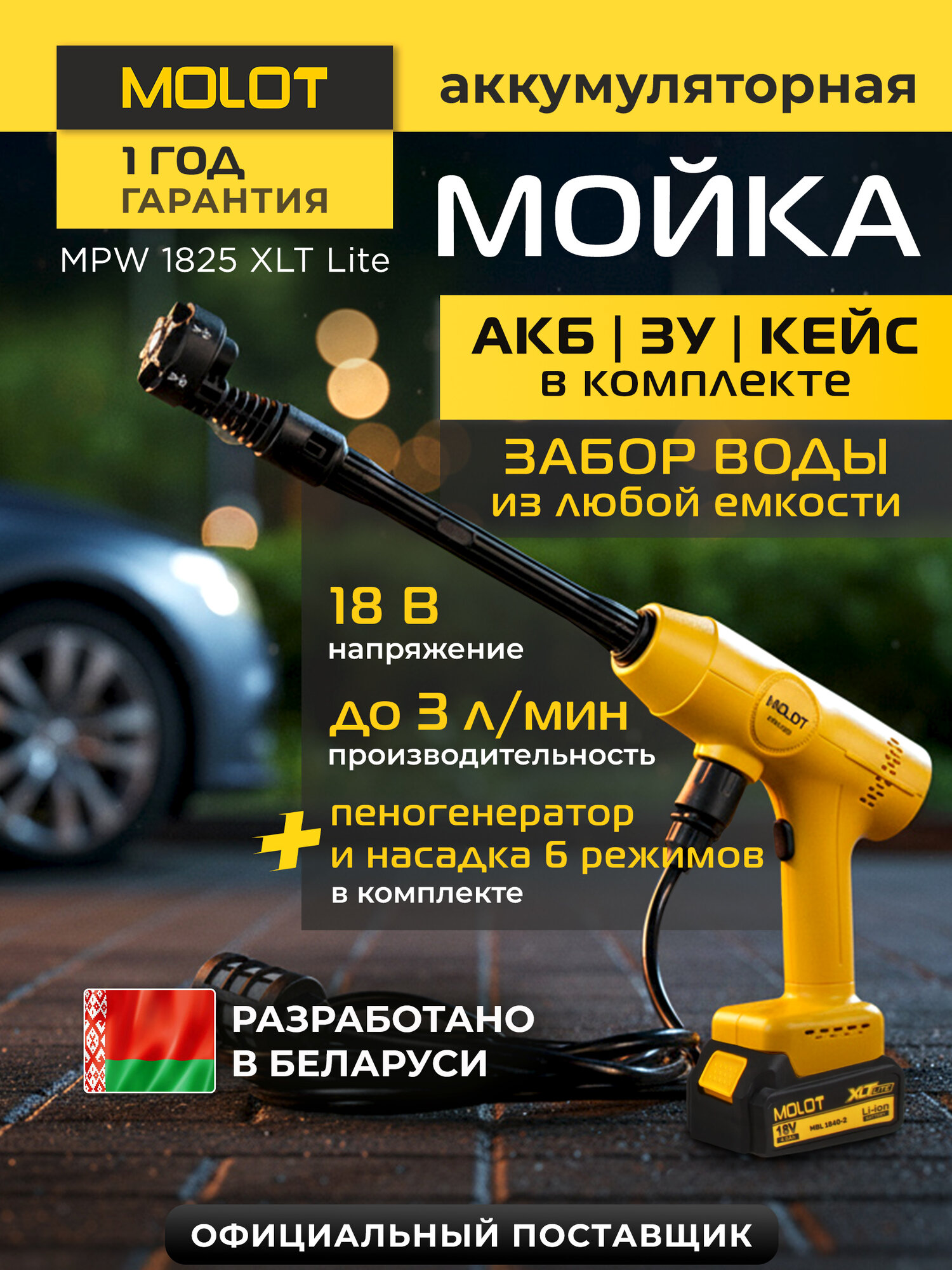 Купить Автомойка высокого давления аккумуляторная в кейсе MOLOT MPW 1825 XLT Lite SET (2318011) с доставкой по всей России. Автомойка высокого давления аккумуляторная в кейсе MOLOT MPW 1825 XLT Lite SET (2318011): сравнение цен, характеристики, фото, актуальное наличие и цены.