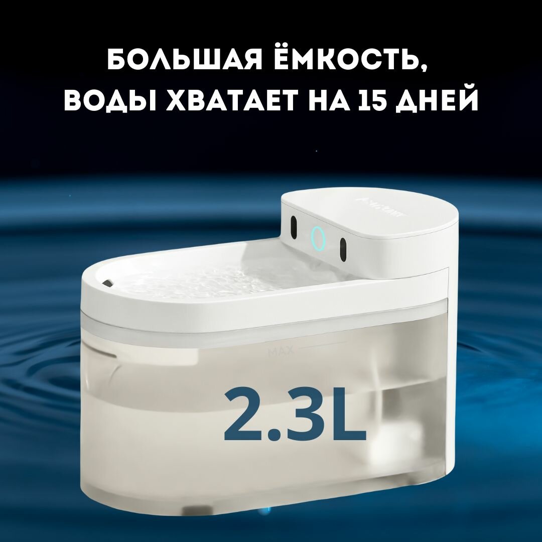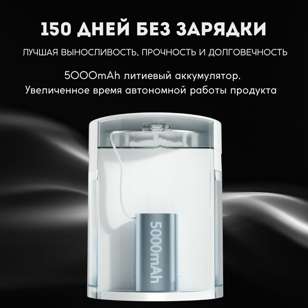 Поилка может работать как от сети через адаптер, так и без зарядки 150 дней за счет 5000 mAh литиевого аккумулятора.