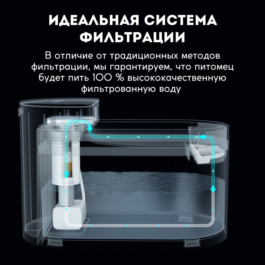 Благодаря семиступенчатой системе фильтрации, потребление воды животным становится очень гигиеничным, что снижает риск развития различных болезней, в том числе и мочекаменной. Прибор позволит Вам навсегда забыть о пролитых мисках, смене воды в течение дня и беспорядке в зоне кормления. Работает абсолютно без шумно. Благодаря продуманной конструкции вода непрерывно циркулирует и общий уровень шума вместе с мотором менее 30 Дб. э
