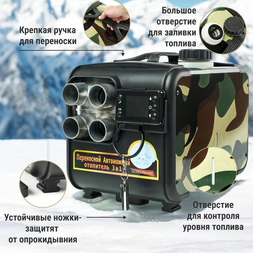 Нагревательный автономный отопитель, собранный в компактном корпусе и готовый к использованию. Это универсальная отопительная воздушная печь обеспечивает эффективный обогрев помещения, ведь мощность обогревателя регулируется до 8 кВт и имеет 3 варианта подключения: 12; 24; 220В. Объем топливного бака переносной печки составляет 5 литров. Комнатный сухой фен работает на дизельном топливе. Нагреватель довольно портативный, что позволяет использовать его где угодно дома, в мастерской, в теплице или в гараже, брать его на дачу, использовать для рыбалки или туризма. Газель, автомобильный салон или походная туристическая палатка тоже прекрасно подойдут для использования такого конвектора. Кроме того техника оснащена удобным пультом управления, что упрощает задачу в настройке и эксплуатации оборудования. Эта современная и технически продвинутая тепловая пушка, с мощностью в 220 вольт, имеет функцию тепловентилятора и обеспечивает равномерное распределение тепла по площади всей комнаты. Очаг эффективно подогревает воздух и обогревает пол, создавая уютную атмосферу, даже в холодные зимние дни. Благодаря своей надежности и универсальности оборудование подойдет и для туристов тоже. Подогрев кабины автомобиля от радиатора также возможен. Этот напольный автообогреватель подойдет для машин любого размера. Такая климатическая бытовая автономка станет незаменимым помощником в обеспечении комфортного отопления.