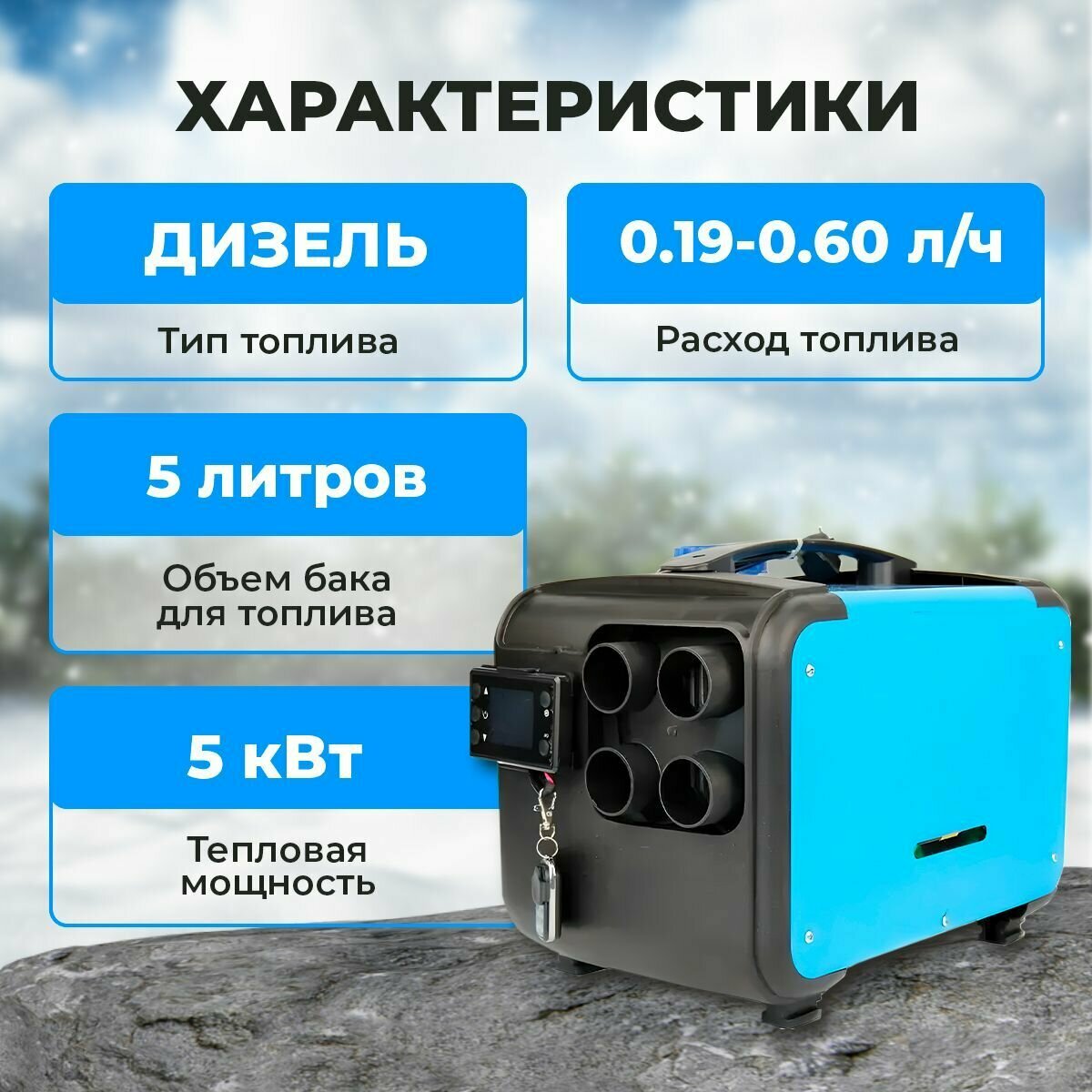 Мощность отопителя составляет 5 кВт, что позволяет обогреть помещение площадью до 80 квадратных метров. Благодаря дизельному двигателю, он обеспечивает быстрое и равномерное распределение тепла, что позволяет достичь комфортной температуры в помещении всего за несколько минут.