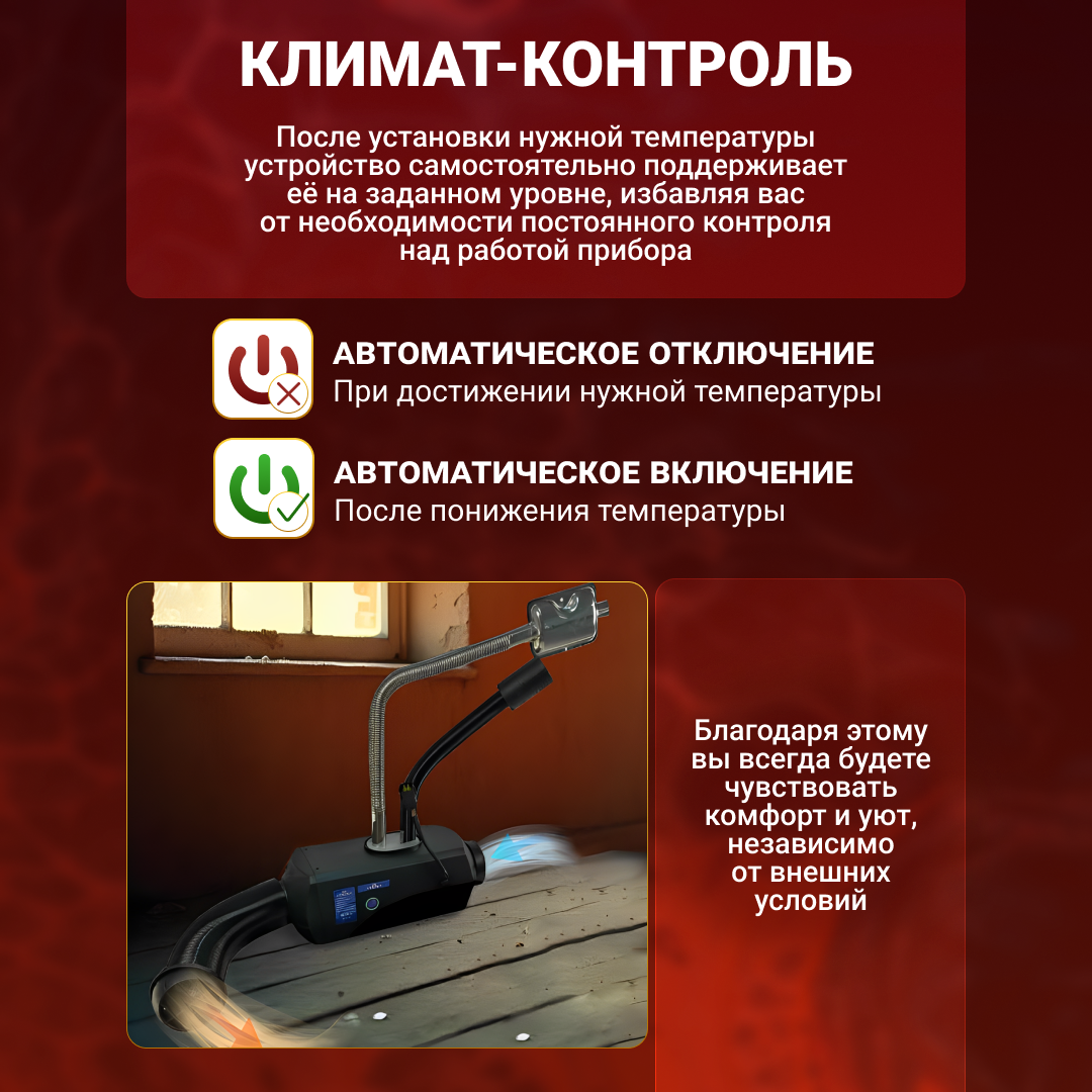 Дизельная пушка оборудована встроенной системой климат-контроля. После установки нужной температуры устройство самостоятельно поддерживает её на заданном уровне, избавляя вас от необходимости постоянного контроля над работой прибора. Благодаря этому вы всегда будете чувствовать комфорт и уют независимо от внешних условий.