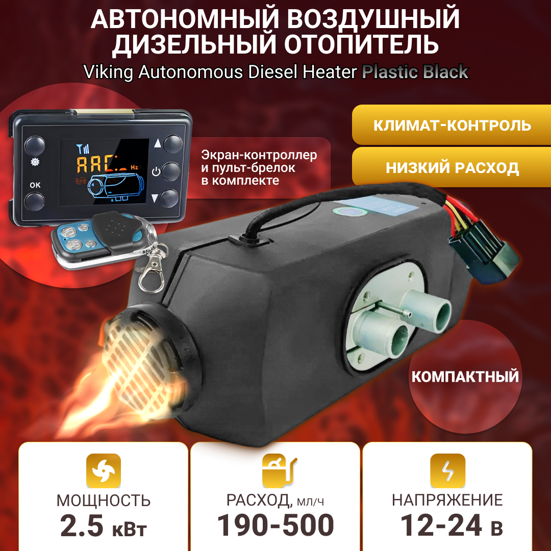 Viking Autonomous Diesel Heater 2.5kW 12V/24V-1 Plastic Black – это автономный дизельный отопитель. Он представляет собой термовентилятор с камерой сгорания воздушно-топливной смеси, окруженной металлической рубашкой. Мощность устройства составляет 2.5 кВт, оно работает от напряжения 12 и 24 В. Отопитель компактен и подходит для автомобилей, домов, гаражей и других помещений. Оснащён климат-контролем, поддерживающим заданную температуру без необходимости ручной регулировки. Управление осуществляется через корпус или дистанционный пульт, работающий на расстоянии до 50 м. Запуск происходит после разогрева свечей накаливания, занимающего 3–5 минут. Комплектация: сухой фен, проводка, пластиковый бак под топливо, площадка для корпуса печки, выхлопная и выпускная труба, труба подачи нагретого воздуха, топливный насос, воздушный фильтр, топливный фильтр, топливопровод, блок управления, брелок дист. запуска, хомуты, крепеж, глушитель, инструкция на русском языке.