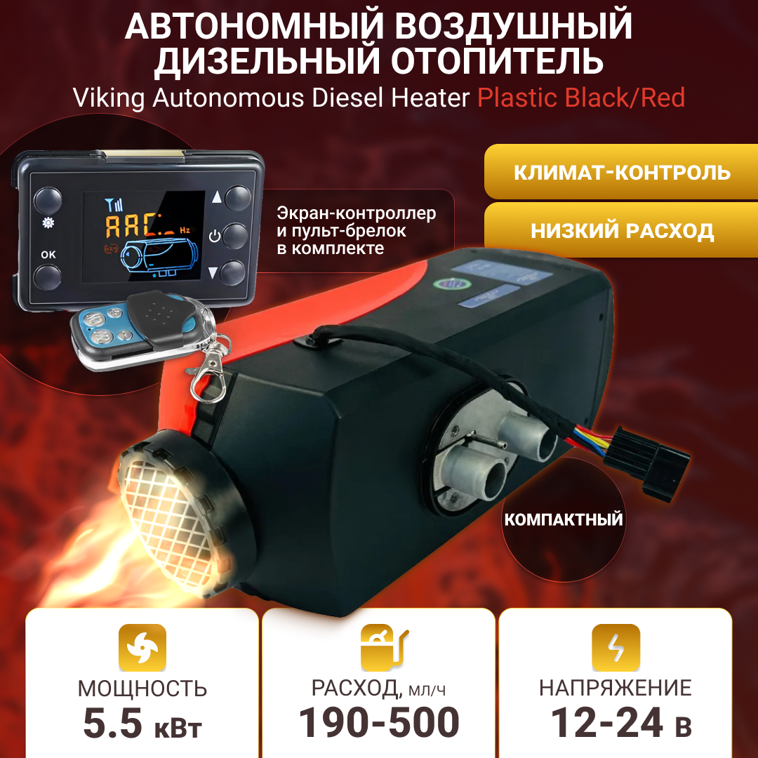 Viking Autonomous Diesel Heater 5.5kW 12V/24V-1 Plastic Black/Red – это автономный дизельный отопитель. Он представляет собой термовентилятор с камерой сгорания воздушно-топливной смеси, окруженной металлической рубашкой. Мощность устройства составляет 5.5 кВт, оно работает от напряжения 12 и 24 В. Отопитель компактен и подходит для автомобилей, домов, гаражей и других помещений. Оснащён климат-контролем, поддерживающим заданную температуру без необходимости ручной регулировки. Управление осуществляется через корпус или дистанционный пульт, работающий на расстоянии до 50 м. Запуск происходит после разогрева свечей накаливания, занимающего 3–5 минут. Комплектация: сухой фен, проводка, пластиковый бак под топливо, площадка для корпуса печки, выхлопная и выпускная труба, труба подачи нагретого воздуха, топливный насос, воздушный фильтр, топливный фильтр, топливопровод, блок управления, брелок дист. запуска, хомуты, крепеж, глушитель, инструкция на русском языке.