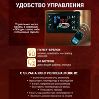 Управление отопителем осуществляется через интуитивно понятную панель с кнопками и ЖК-дисплеем либо с помощью дистанционного пульта, работающего на расстоянии до 50 метров. Это даёт вам свободу выбора способа взаимодействия с устройством, делая использование максимально комфортным.