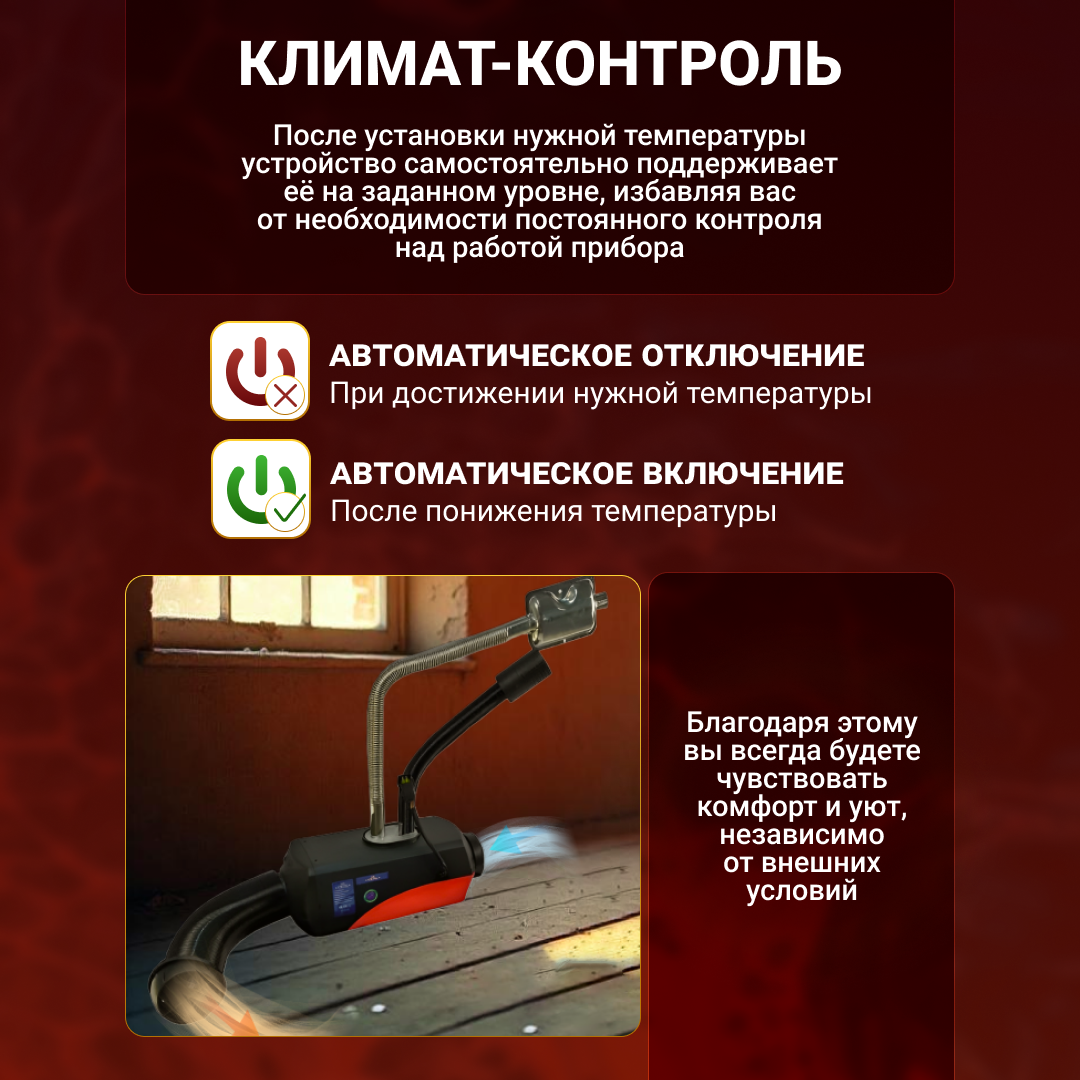 Дизельная пушка оборудована встроенной системой климат-контроля. После установки нужной температуры устройство самостоятельно поддерживает её на заданном уровне, избавляя вас от необходимости постоянного контроля над работой прибора. Благодаря этому вы всегда будете чувствовать комфорт и уют независимо от внешних условий.