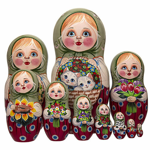 Расписная матрешка отличается уникальностью декора. Первая матрешка девочка держит в руках корзину с котенком, остальные держат в руках цветы.