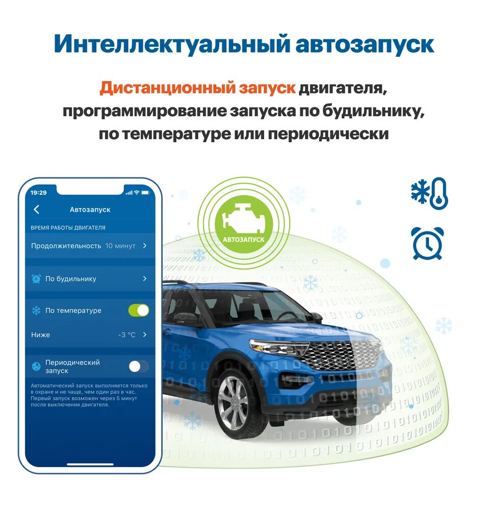 Интеллектуальный автозапуск позволяет осуществлять дистанционный и автоматический запуск двигателя по температуре, в заданное время или периодически