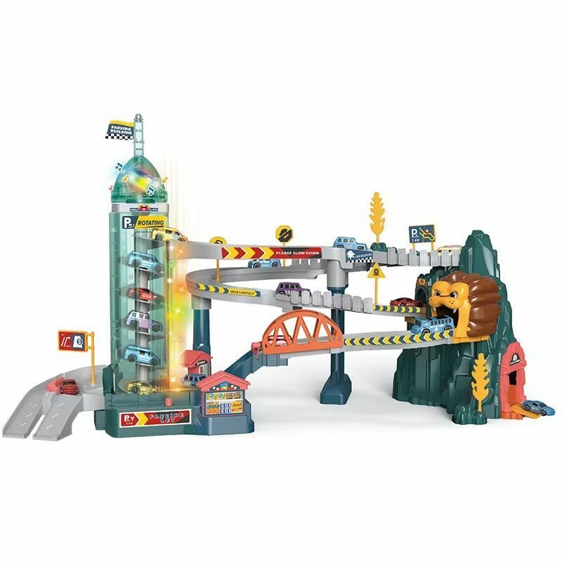 Наш трек для машинок состоит из музыкального многоуровнего автотрека, включающего 4 машинки и лифт. Лифт работает как в автоматическом режиме, при помощи кнопки, так и в ручном режиме, вращая флажок сверху лифта и поднимает автомобили на вершину трека. В мультипарке машинок вы также найдете мост, тоннель из пасти льва, парковку и игрушечный гараж. Автопарковка гоночная трасса легко собирается, детали надежно стыкуются между собой. Сам автотрек с музыкой и светом зигзагообразной формы, с парковой на вершине скалы, мостом, гаражом, заправкой и дорожными знаками.