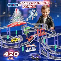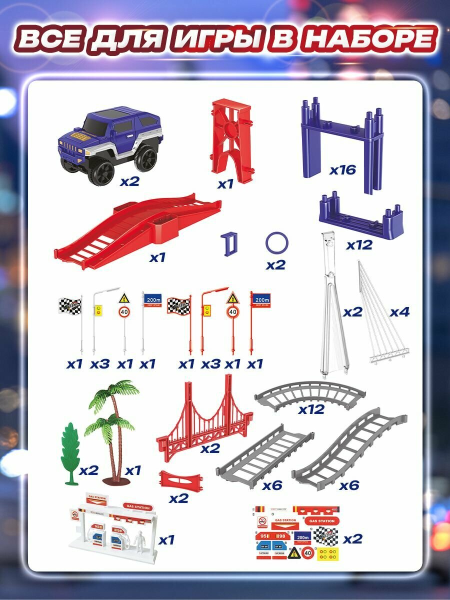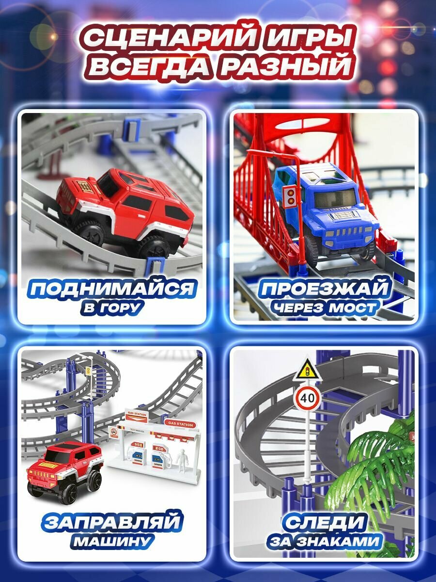 Купить Автотрек с машинками Play Okay «Американские горки» трек гоночный многоуровневый с дорожними знаками мостами, светом и звуком, заправкой, игровой набор и игрушка для мальчиков и девочек — 86 деталей с доставкой по всей России.
