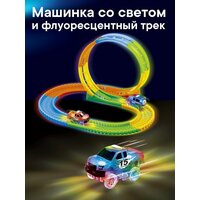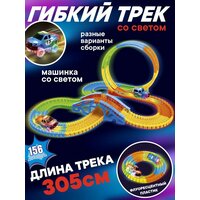 Детский гибкий автотрек станет отличной и очень интересной игрушкой для вашего ребенка! 156 деталей, 305 сантиметров гибких путей, мост, мертвая петля, эффект флуоресценции и машинка на батарейках со светом! Колея 5,5 сантиметров. Конструктор помогает развить моторику, воображение, внимательность, пространственное мышление и творческие способности. Автотрек одна из популярных игрушек для детей, которая способна восхитить и заинтересовать даже родителей. Особенность гоночного трека заключается в его строении: небольшие звенья сцепляются в единое дорожное полотно, а благодаря гибкой сцепке трек может поворачивать и петлять в разные стороны. Трассу можно сделать выпуклой для имитации подъемов и холмов, а также вогнутой для резких и быстрых спусков. Звенья гибкого автотрека взаимозаменяемые и могут соединяться с любой другой его частью. Ребенок сможет использовать мебель, предметы и игрушки в своей комнате как части трека для машинки, прокладывая трассу между ножками стола, через подушку, вверх на диван. Разные варианты сборки гибкого трека дают раздолье для фантазии малыша! Помимо всего прочего качественный полимер, из которого изготовлена детская трасса, имеет свойство флуоресценции, дороге нужно всего несколько минут постоять под ярким дневным светом и в темноте она начнёт светиться. Мертвая петля гоночного трека с машинкой имеет зацепы по бокам и гребенку по середине, благодаря чему машинка легко преодолевает эти участки трассы. Машинка светится при включении и едет сама, имеет прорезиненное покрытие задних колес для хорошего сцепления, а также 5 ярких светодиодов. Комплектация детского игрового набора: машинка со светом 1 шт, звенья гибкого полотна 144 шт, дуги мертвой петли 5 шт, заезды на мертвую петлю 2 шт, элементы мостика 4 шт. Автотрек с машинкой отличная игрушка для мальчиков и девочек, рекомендуется как развивающий подарок в день рождения, новый год или другой праздник. Элементы питания: 1 батарейка тип АА для машинки (в комплект не входят).
