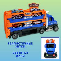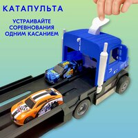Купить Автотрек трейлер с 6 металлическими машинками, Автовоз TRUCK игрушечный со звуком и светом + катапульта, трансформируется в большой гоночный трек 160 см с доставкой по всей России.