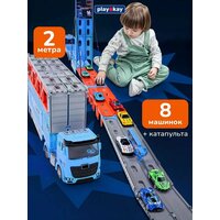 Купить Автотрек трейлер с 8 металлическими машинками, Автовоз Play Okay игрушечный со звуком и светом + катапульта, трансформируется в большой гоночный мост 2м, детские игрушки для мальчиков с доставкой по всей России.