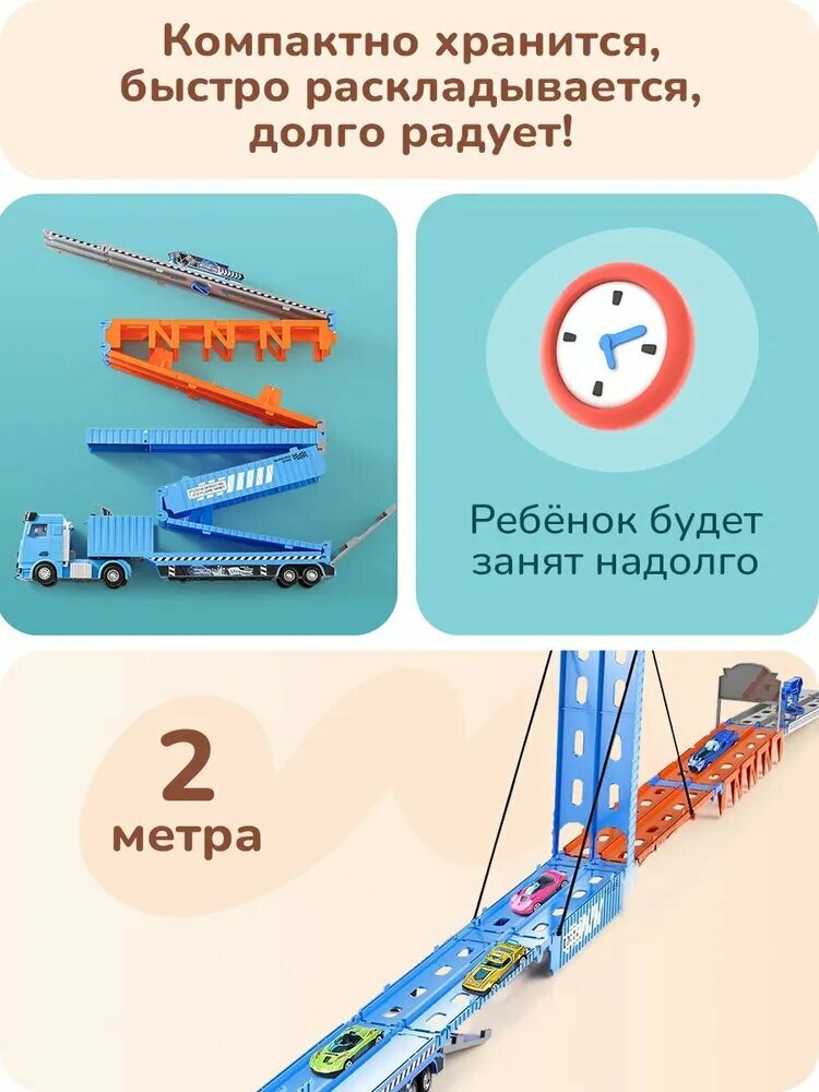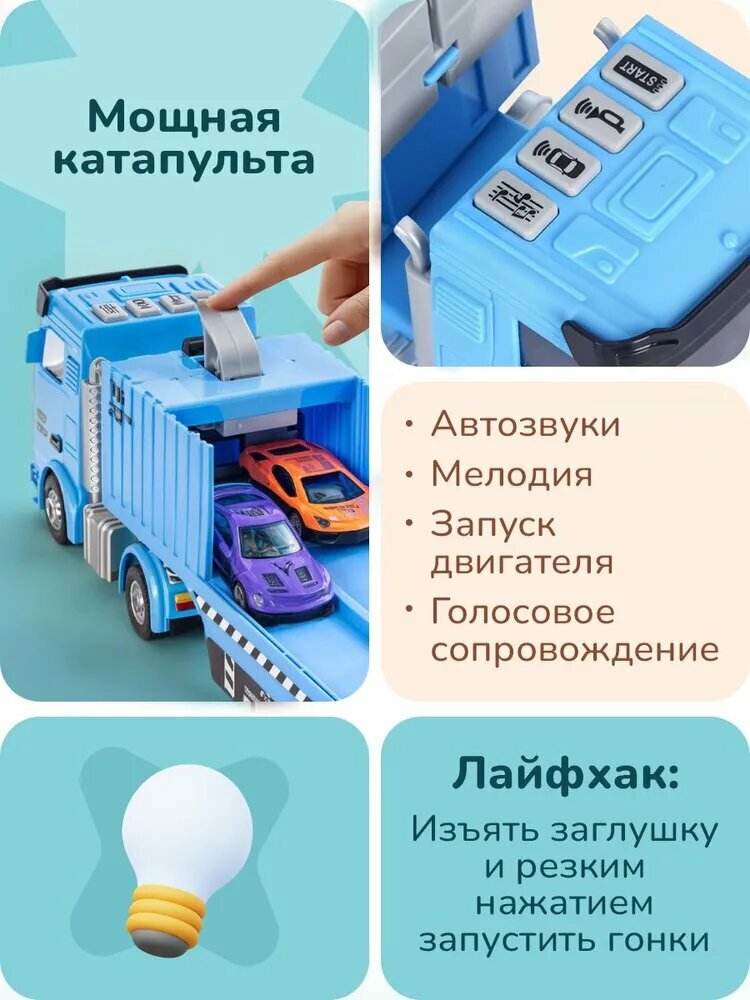 Автотрек трейлер с 8 металлическими машинками, Автовоз Play Okay игрушечный со звуком и светом + катапульта, трансформируется в большой гоночный мост 2м, детские игрушки для мальчиков: сравнение цен, характеристики, фото, актуальное наличие и цены.