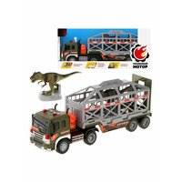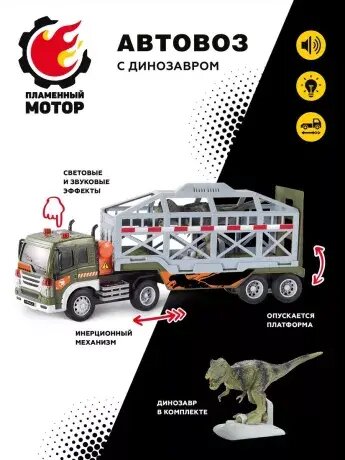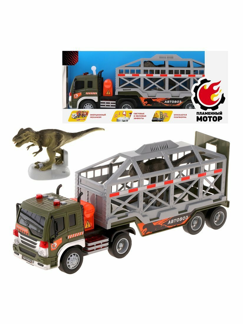 В кузове этого автовоза ТМ «Пламенный мотор» в этот раз находятся не машины, а динозавр! Как он там оказался? Все очень просто: платформа автовоза опускается и поднимается вручную. Автовоз вместе с динозавром готов отправиться в пункт следования, не отклоняясь от намеченного маршрута.