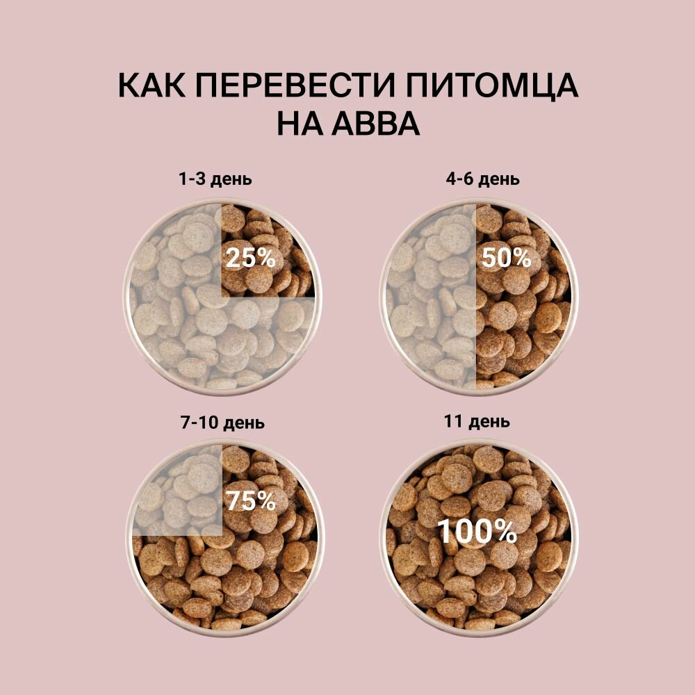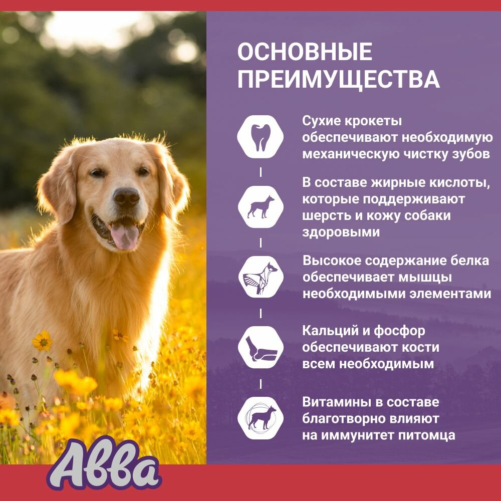 Авва – это натуральные ингредиенты, баланс витаминов и минералов, большой ассортимент вкусов. Мы трепетно относимся к здоровью питомцев и стараемся учитывать потребности каждого при производстве кормов и лакомств. Рационы Авва сбалансированы по составу и подходят для собак всех пород.