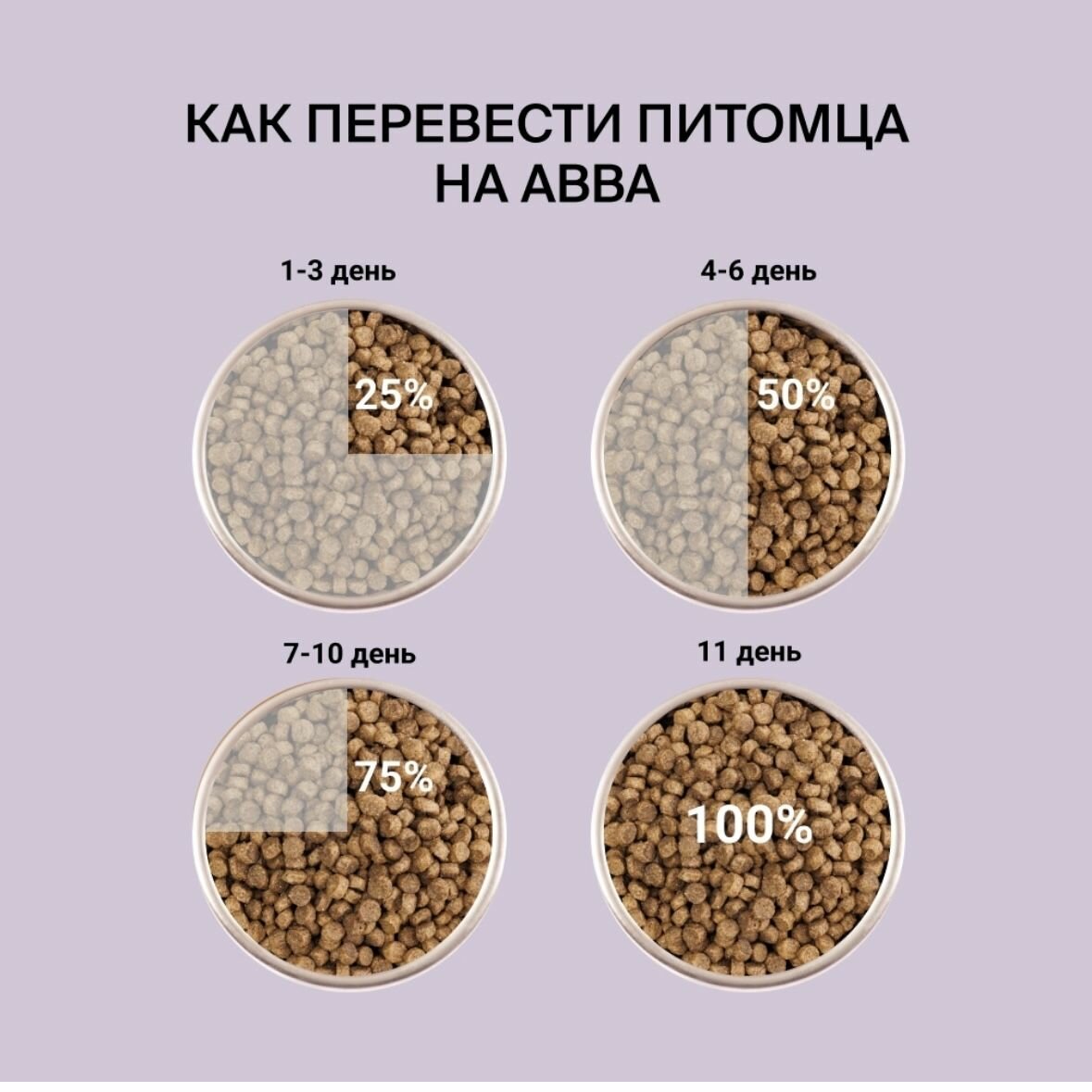 При переходе на корм АВВА постепенно вводите его в рацион собаки в течение 4-5 дней. Разделите дневную норму, указанную в таблице, на количество кормлений в день. Придерживайтесь рекомендуемых норм кормления, индивидуальная норма кормления Вашей собаки зависит от ее возраста, условий содержания, темперамента и активности. У собаки должна быть постоянно чистая и свежая вода для питья. Корм полнорационный и сбалансированный, поэтому дополнительное добавление витаминов или минералов в рацион собаки не требуется.