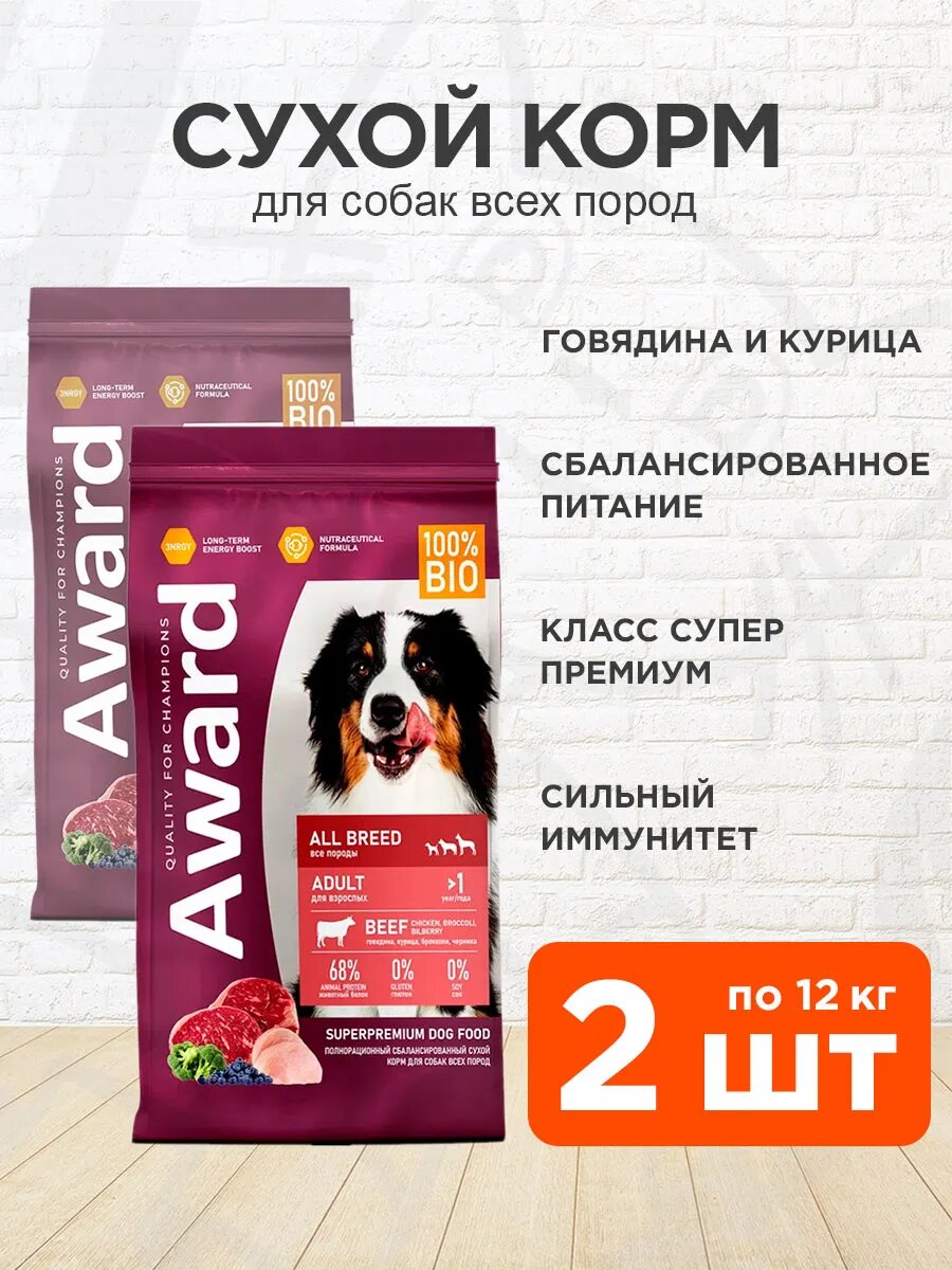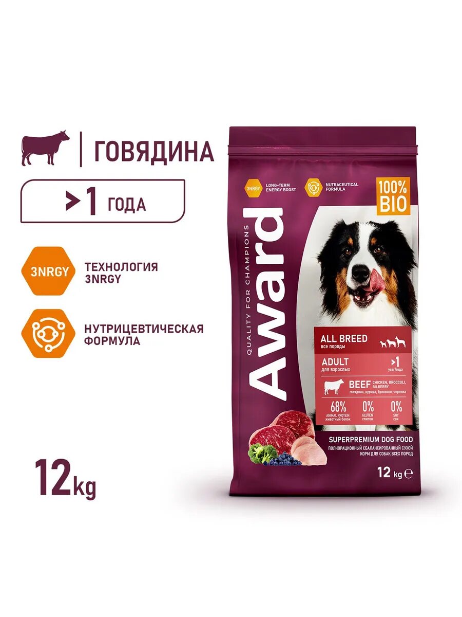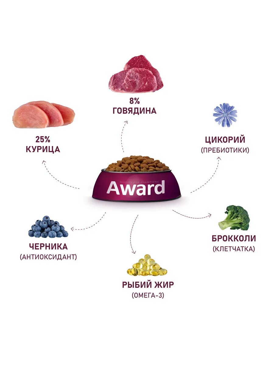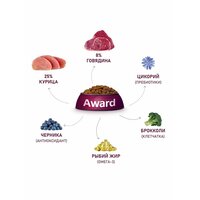 Сухой корм AWARD ADULT ALL BREED для взрослых собак всех пород с говядиной и курицей с добавлением брокколи и черники.